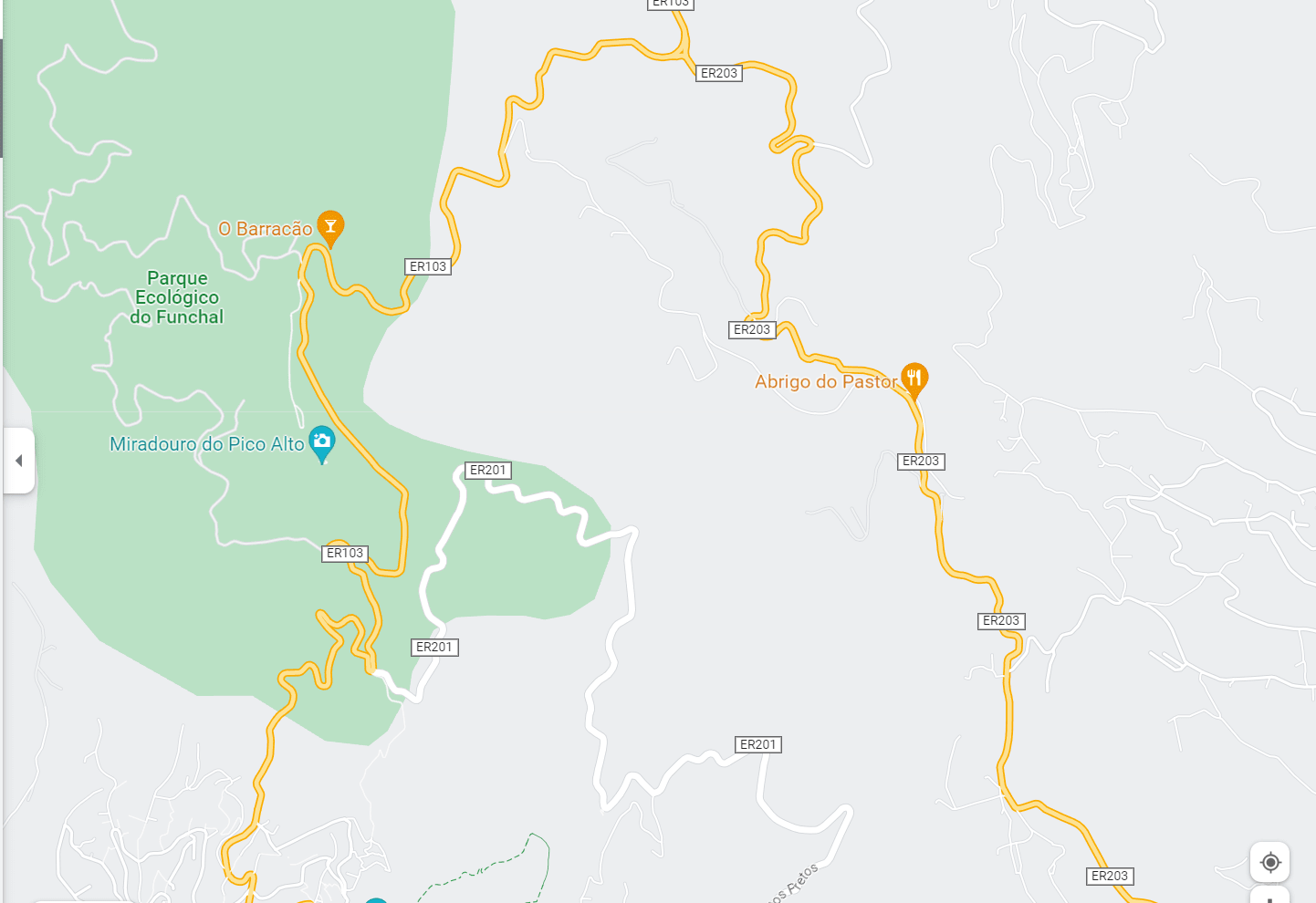 As condições das vias rápidas são óptimas e rapidamente se chega a qualquer lado. Ou melhor dizendo a qualquer lado que fique na costa, já que as vias rápidas dão a volta à ilha junto à costa. Agora quando falamos em atravessar a ilha pelo seu interior ou querer chegar a um lugar que não seja junto à costa, respirem fundo. São curvas e contracurvas seguidas imediatamente por curvas e contracurvas. Na Madeira foi a minha primeira vez. A primeira vez que enjoei num carro. Olhei só para um exemplo destes pequenos troços de caminho. É que nem dá para ir rápido porque as curvas são tipo 90º. São múltiplos de 180º em curvas durante 30 minutos. O meu conselho é que pratiquem rally antes de virem ou então não se safam. E claro que com isto adicionem mais 1 hora ou assim a qualquer percurso que queiram fazer durante o dia em que tenham de andar às voltas. Vejam só aquelas linhas amarelas a dar nós de pescador.