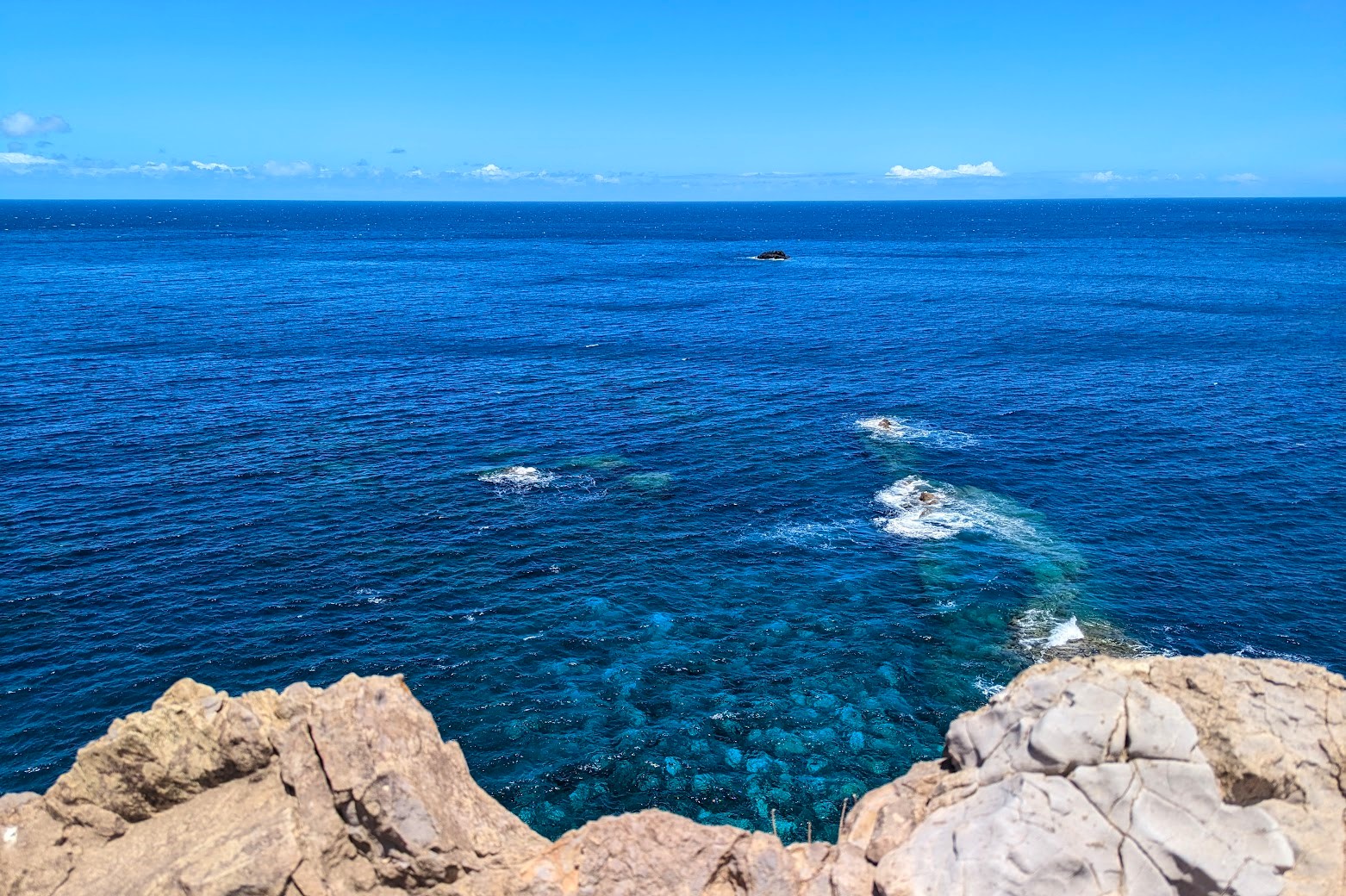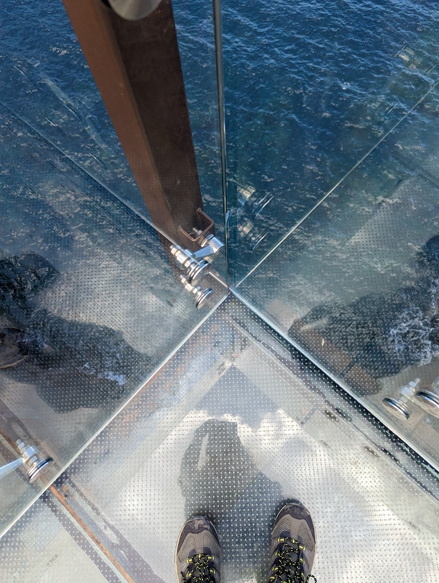 E com esta paragem rápida fomos ao próximo miradouro – o Miradouro do Guindaste. Para mim este foi um dos miradouros que ficou mais marcado na memória, principalmente as secções do miradouro com chão de vidro de onde se podia olhar para o mar e rocha que ficava mesmo debaixo dos nossos pés. Mesmo sabendo que não vamos cair, fica aquele friozinho no estômago quando damos o primeiro passo. Para quem tem medo de alturas, como o caso do meu companheiro de viagem, ainda é mais difícil dar o primeiro passo. Foi talvez aqui a primeira vez que comentámos o azul do mar na ilha da Madeira, um azul turquesa intenso com águas tão límpidas que parece quase artificial.