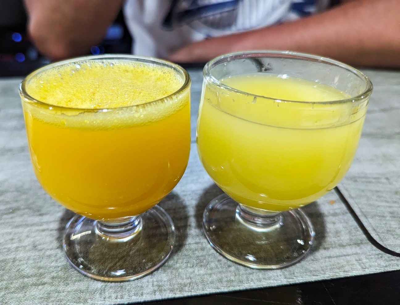 E chegava a hora de jantar – ou melhor algo entre um almoço muito tardio e um jantar talvez cedo para a maioria. A 5 minutos de distância do Miradouro do Véu da Noiva em São Vicente fica o restaurante Caravela. Por sinal também é em São Vicente que se encontram as famosas grutas de São Vicente, mas encontram-se encerradas temporariamente. Ainda não sabíamos, mas foi neste restaurante foi onde tivemos a melhor refeição de toda a viagem.Começámos com um bolo do caco com manteiga e ervas e lapas grelhadas. Para acompanhar nada como uma brisa de maracujá, o sumo tradicional da ilha. Ambos tínhamos tido uma má experiência quando comemos lapas pela primeira vez nas ilha das Flores, nos Açores, e por isso estávamos reticentes. Mas sem medos. Neste restaurante passei a adorar este petisco. Também diria que foi aqui o nosso melhor bolo de caco.