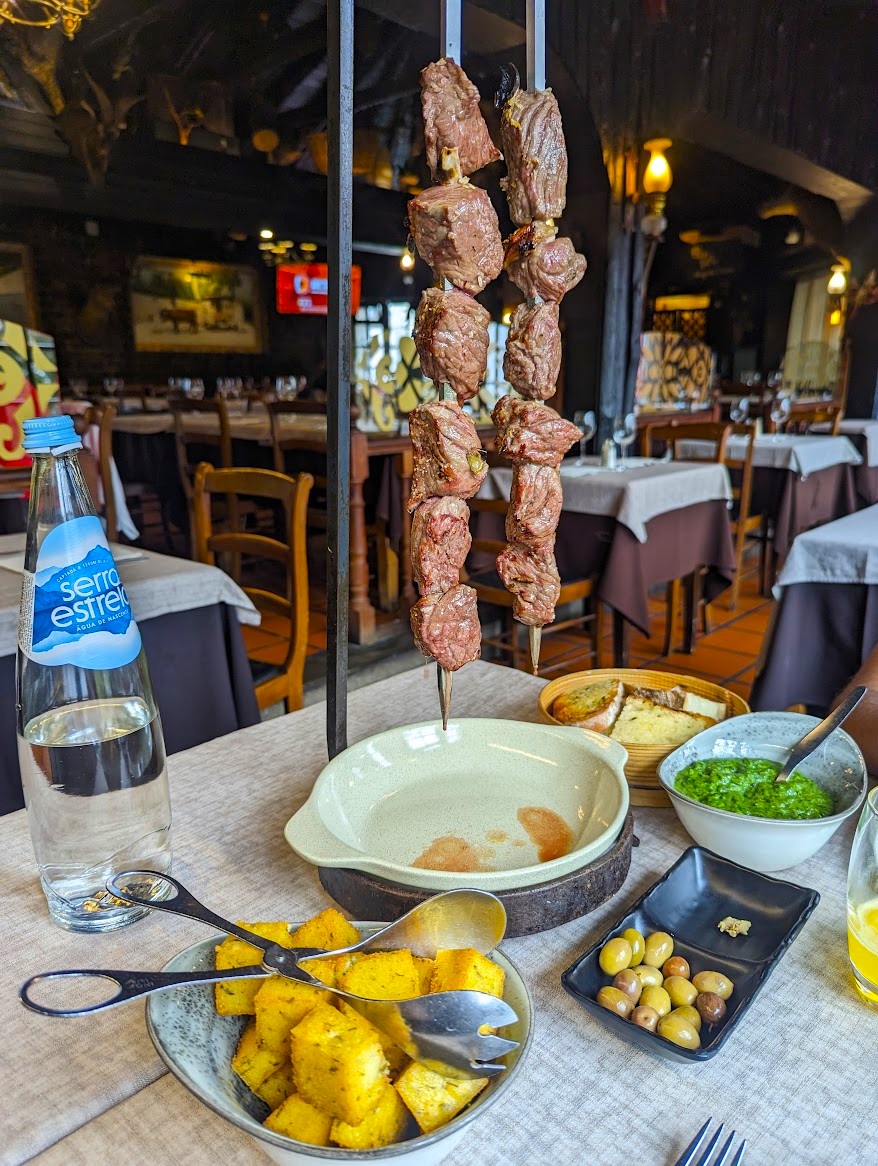 Nós decidimos ir jantar a um dos restaurantes mais conhecidos da Madeira – O Abrigo do Pastor. Porque não pode passar uma visita à Madeira sem experimentar a espetada regional. A carne era muito tenra e bastante saborosa. Não ficámos fãs do esparregado e do pão de batata-doce, mas gostei bastante do milho frito.
