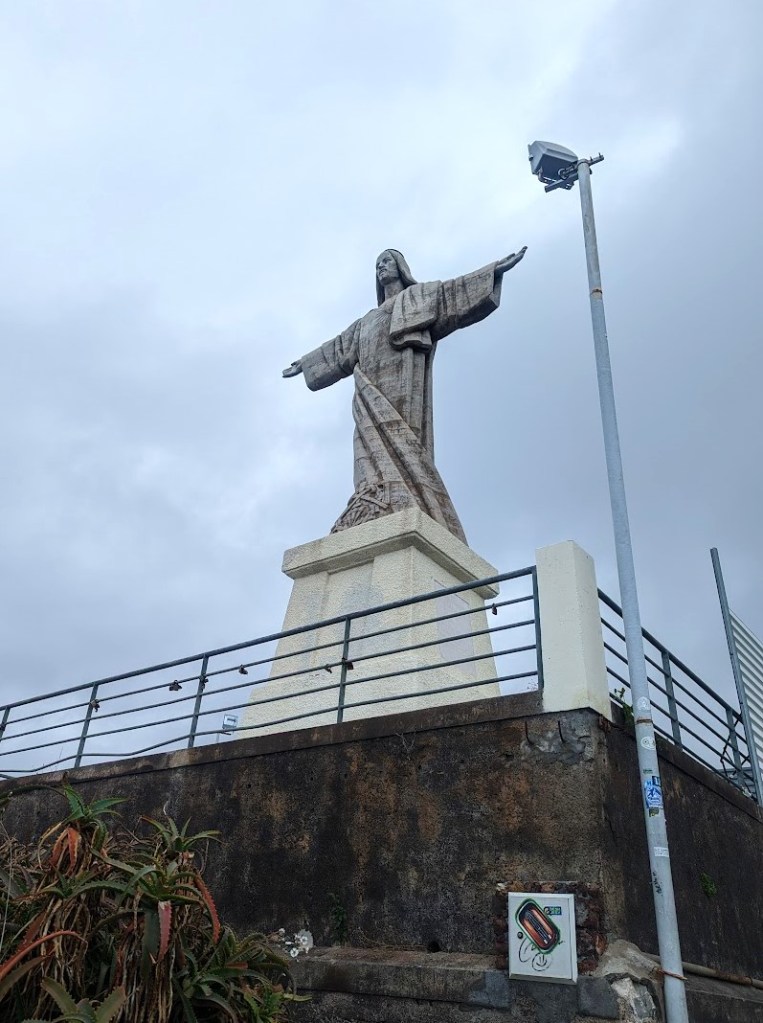 A segunda paragem foi num dos lugares muito procurados na Madeira – o Cabo Girão. Muito procurado porquê? Para além de ser um espetacular ponto de observação, o chão é de vidro e a descida da falésia quase vertical, criando uma experiência vertiginosa. Têm de se pagar para entrar para o observatório e tem um custo de 2 euros por pessoa. Nós nem sequer o fizemos porque a esta altura havia um nevoeiro cerrado acompanhado com uma súbita carga de água. Achámos que nos irmos molhar sem pudermos ver nada de paisagem não valia muito a pena. Tentando fugir à chuva fomos até ao Cristo Rei da Ponta do Garajau. A grande estátua de Jesus Cristo, de braços abertos, voltada para o mar é o começo de um miradouro com uma vista sobre parte da baía do Funchal e do património natural do Garajau. Sem esquecer de mencionar uma paisagem extensa do Oceano Atlântico.