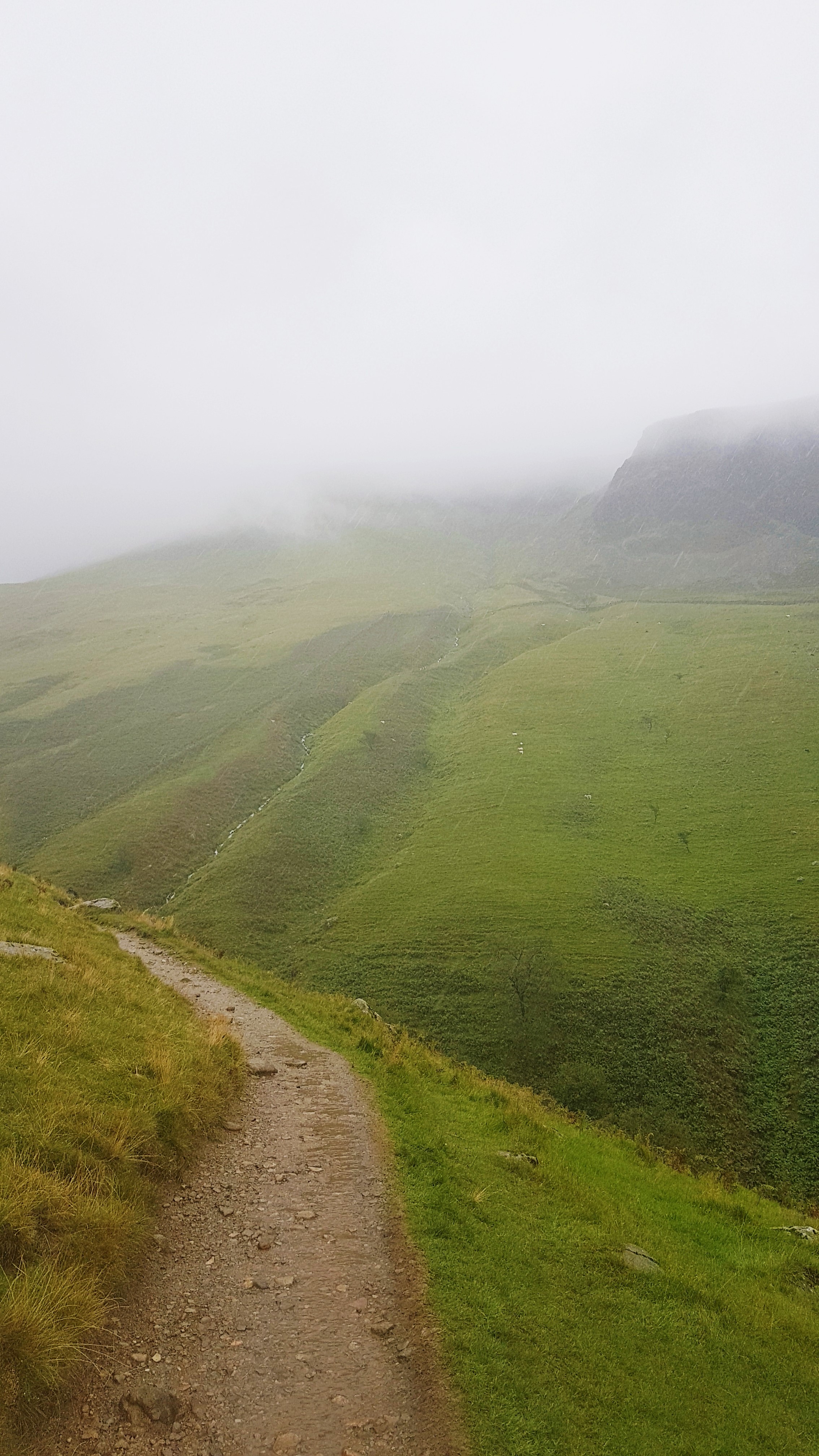 5– Outra coisa também terão que fazer, se quiserem desfrutar verdadeiramente a experiência desta zona de Inglaterra, é escalada. Não digo escalada pesada, mas subir algumas montanhazinhas. Eu nunca na vida tinha subido tanta montanha, até de gatas andei. O que é difícil é escolher que monte subir, pelo menos para nós que não somos nem alpistas nem sequer atléticos, e que tivemos que decidir no que valia ou não a pena nos aventurar. Infelizmente, apesar de termos subido ao ponto mais alto de Inglaterra, Scafell Pike, o dia estava péssimo, e quando digo péssimo era chuva a cair a potes e frio e quando chegámos ao pico vimos nickles devido ao nevoeiro. Sim, posso dizer que estive no ponto mais alto de Inglaterra. Agora será que valeu a pena? Ainda estou a ponderar.