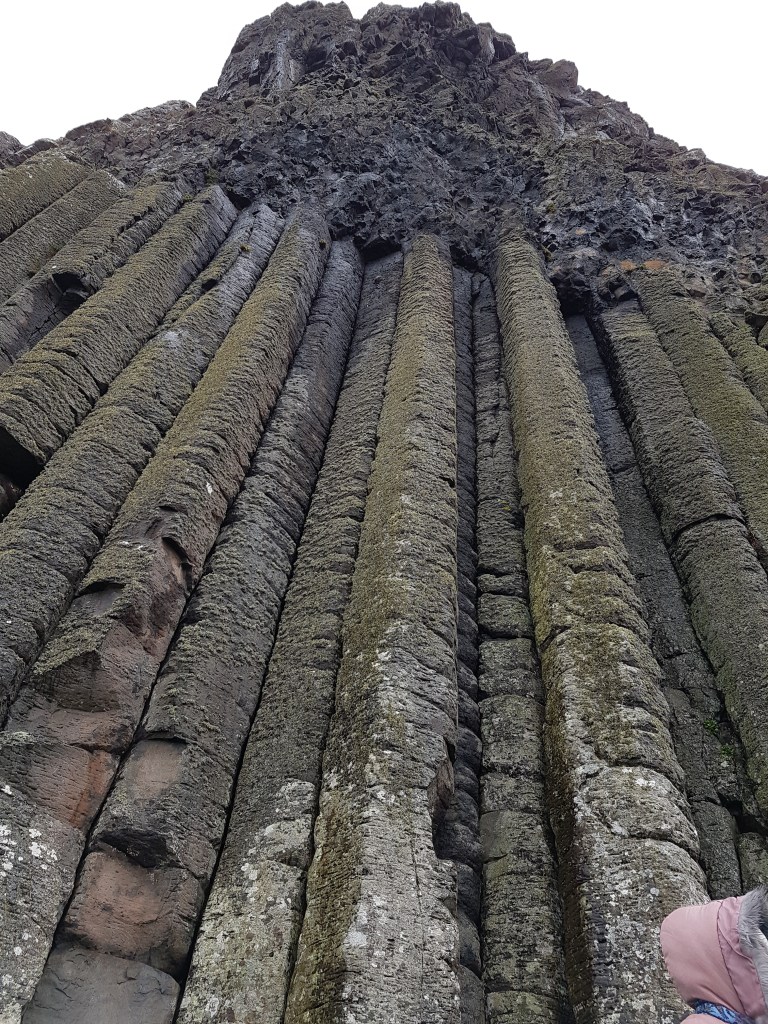 Depois de mais conhecedores de whisky seguimos para a Calçada dos Gigantes. O tempo quando lá chegámos apresentava-se como o que se espera do Reino Unido, chuva e frio. Para não ficarmos completamente encharcados apanhámos um autocarro que desce até perto do mar, onde se encontra efectivamente a Calçada dos Gigantes. Felizmente enquanto aqui estivemos o tempo melhorou e pudemos desfrutar mais à vontade desta zona. Suponho que a maior parte de vós já tenha visto fotografias da peculiar paisagem que aqui nos é oferecida, as muitas colunas prismáticas de basalto como se formassem uma calçada feita para gigantes, daí o nome. Esta zona foi declarada Património da Humanidade pela UNESCO em 1986 e como Reserva Natural em 1987.