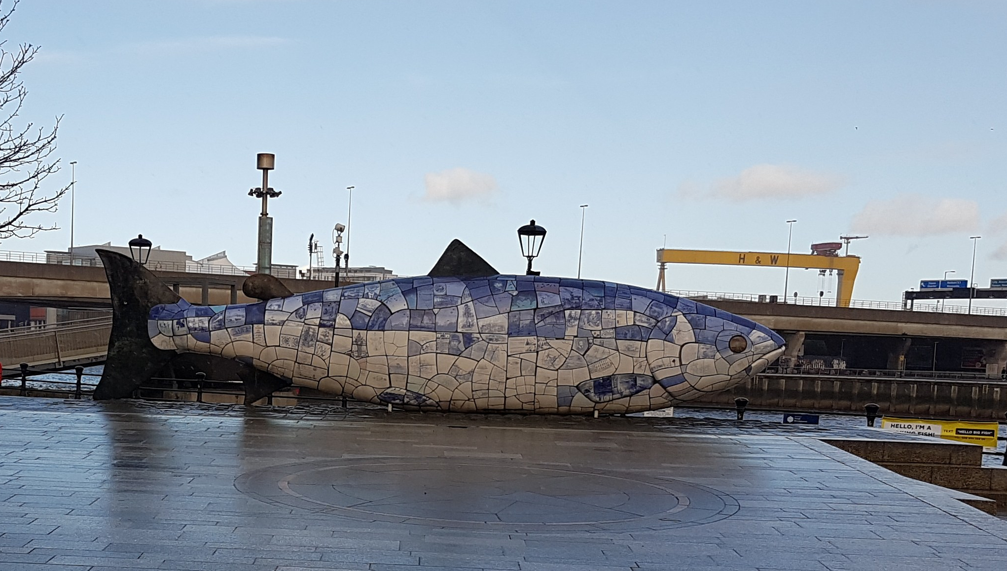 A tarde estava rapidamente a dissipar-se mas não tínhamos vontade de dar a grande volta para o centro da cidade e por isso parámos num bar para beber qualquer coisa. Aqui experimentei o famoso Irish Coffee, mas já me disseram que aquilo não estava bem feito, a ver pela fotografia. Descansámos e ganhando energia fomos para perto do hotel onde íamos jantar. Quando voltámos a passar pela ponte reparámos numa estátua de um peixe, todo em azul em cerâmica, o Big Fish. Esta estrutura foi criada em 1999 para celebrar a a regeneração do Rio Lagan e sua importância histórica para a cidade.