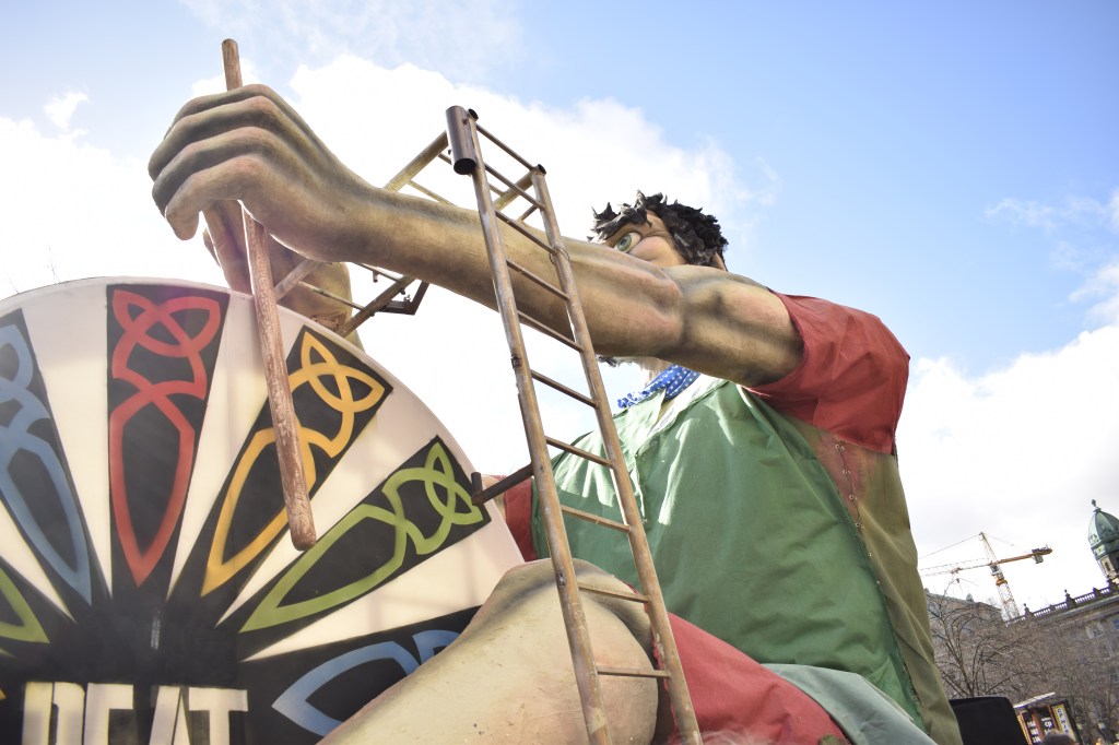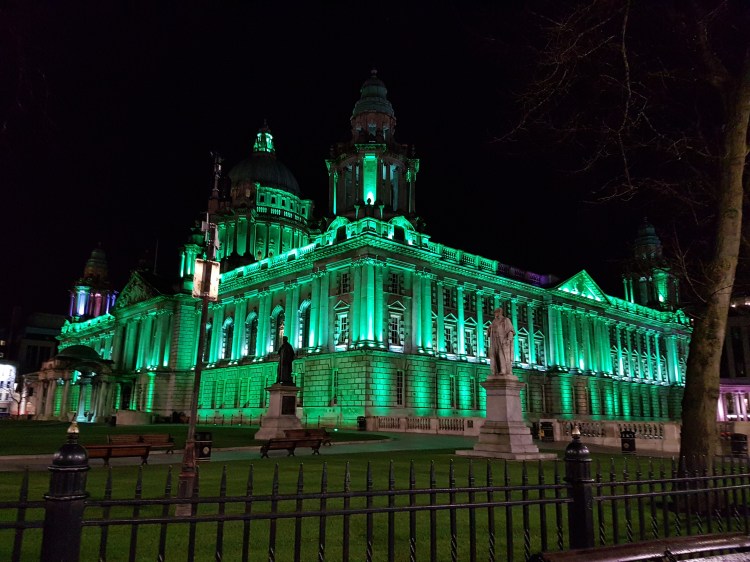 Domingo, dia de São Patrício, o padroeiro da Irlanda. Este é um dia de muitas celebrações por todo o país e Belfast não podia escapar. E era mesmo nesta cidade, Belfast, que nos encontraríamos durante este dia. Tínhamos vários locais planeados para visitar, mas queríamos o fazer com calma, aproveitar o ambiente de festa que se vivia e sentia nas ruas. Em Belfast, ao meio dia e meia iria-se realizar uma parada/procissão em honra a São Patrício. Começaria em frente do edifício do City Hall (câmara municipal) e seguiria por toda a cidade. É um bocadinho como uma mistura entre as marchas populares e o Carnaval em Portugal.