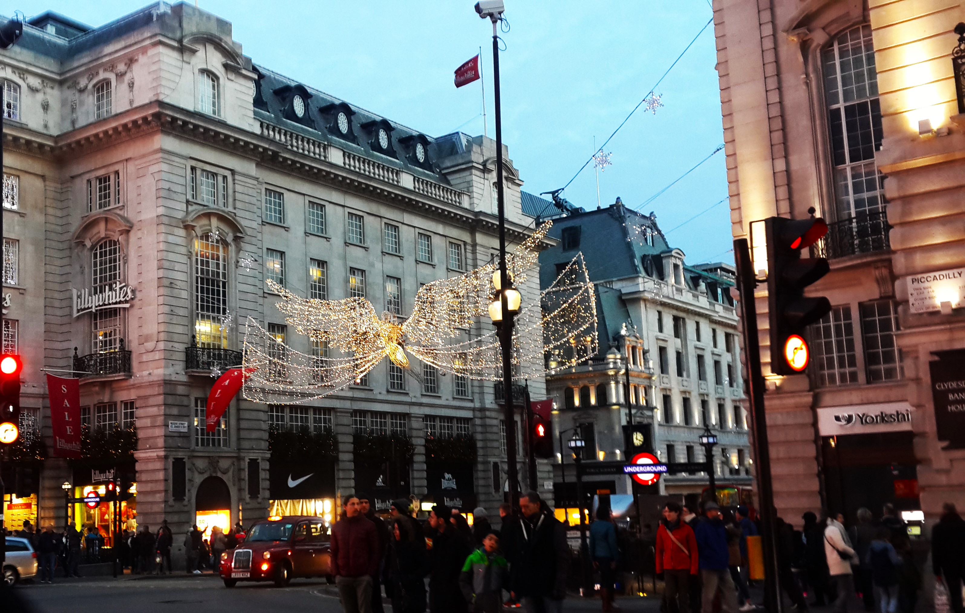 Não se pode perder Covent Garden, um dos locais mais conhecidos durante esta época do ano. A grande árvore de Natal à frente do Covent Market é já um símbolo da época. Depois é seguir para Regent Street, Oxford Street e Carnaby Street para ver as incríveis luzes de natal, desde os anjos iluminados às bolas enormes a luzir.