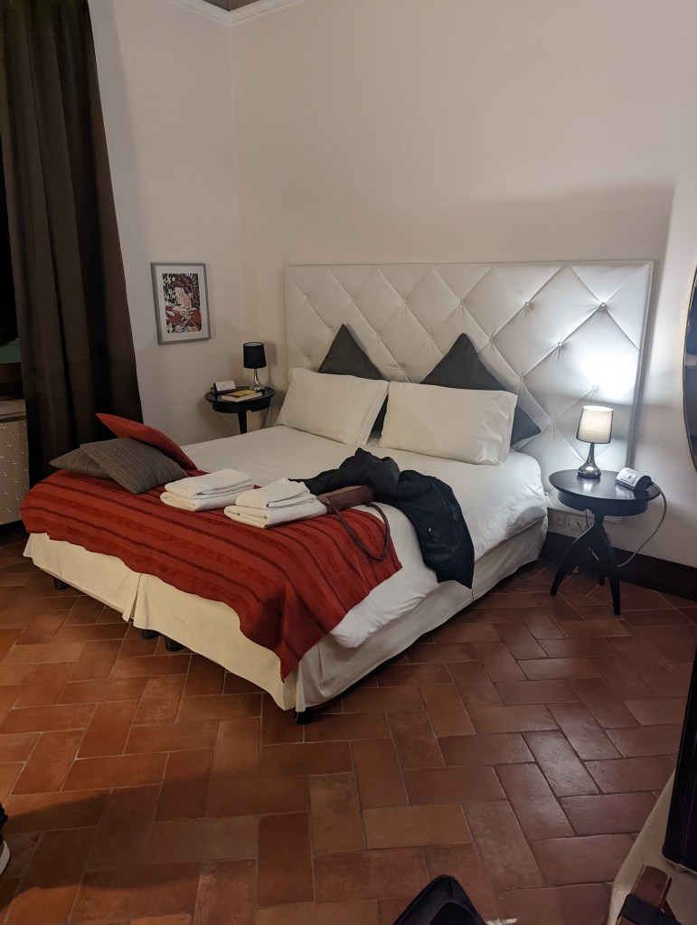 Claro está que a razão para ficar na Casa Calicantus foi o preço – no centro da cidade é preciso dar uma perna, o que a ver agora se calhar não é mau, já que não vais precisar dela para andar tanto, mas mesmo assim escolhemos a Casa Calicantus. E não nos arrependemos porque se tivéssemos ficado no centro da cidade era preciso andar para a estação de comboios, para a o castelo e para ver o arco. E apesar de já ter passado da hora de check-in, receberam-nos a hora tardia. Agora a senhora não falava praticamente inglês nenhum e nós não falamos italiano – então toda a explicação foi como ensinar chimpanzés a abrir portas – uma mistura de repetição de movimentos e grunhidos. E depois ela disse para lá mais umas coisas que não percebemos patavina e que afinal incluía uma taxa qualquer de 6 euros por noite – só descobrimos já no check-out quando ela pediu 18 euros. No entanto, a mulher foi simpática e o quarto era enorme, a casa de banho enorme e também havia uma sala que mal usámos.
