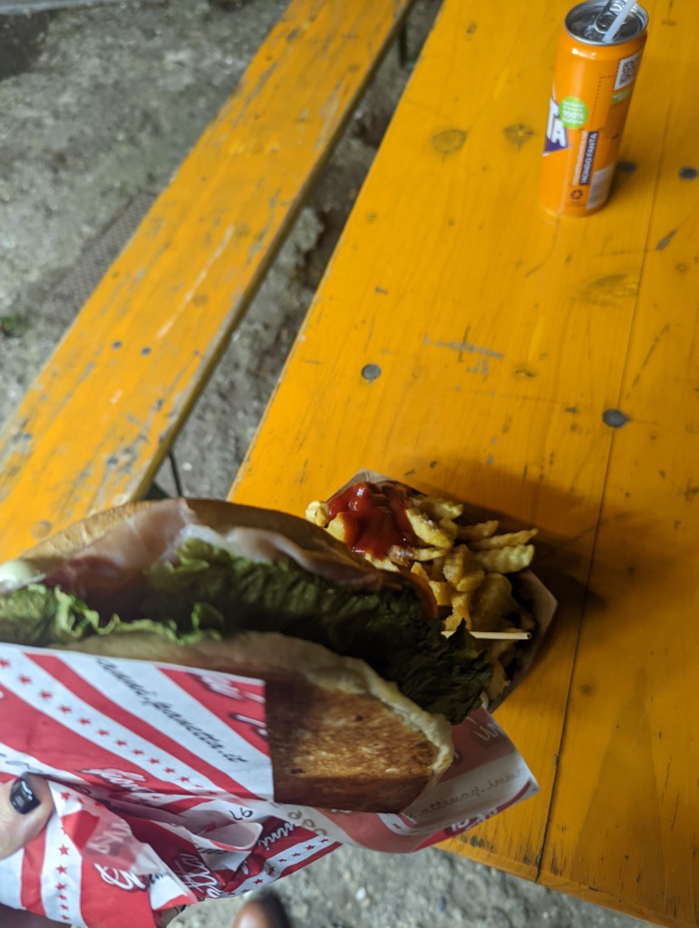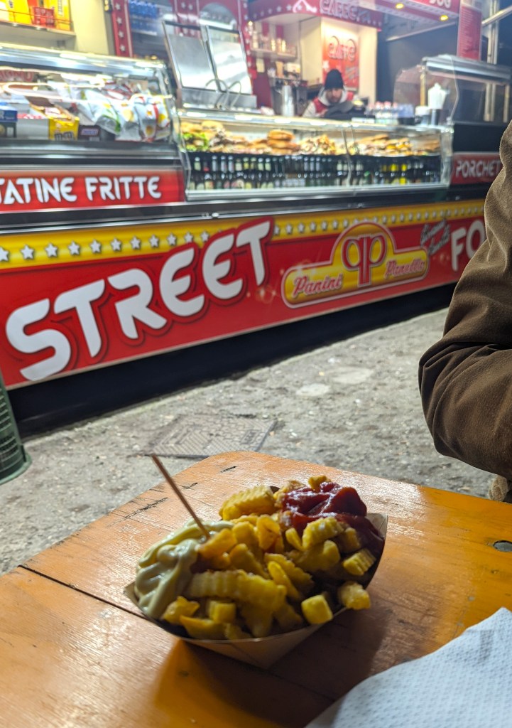 Como chegámos tarde a Milão muitos dos restaurantes já estavam fechados ou quase a fechar ou não serviam comida. Por isso fomos a um sítio super chique, que gritava “Milão” no esplendor da palavra – uma roulotte ao pé do castelo. Tenho a dizer que tenho essa roulotte em alta consideração pois salvou-nos a noite – pedimos batatas fritas, surpreendente boas, e eu pedi um panini com queijo, presunto e salada, que me soube pela vida. O meu marido pediu um hambúrguer e apesar de haver uma parte que estava meio para o cru, foi tudo. Foi um sítio para o desenrasca mas consigo dar melhor review à roulotte do que ao restaurante mais “chique” que fomos (eu deixo este para outro post para não estragar já a viagem).