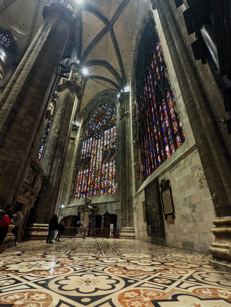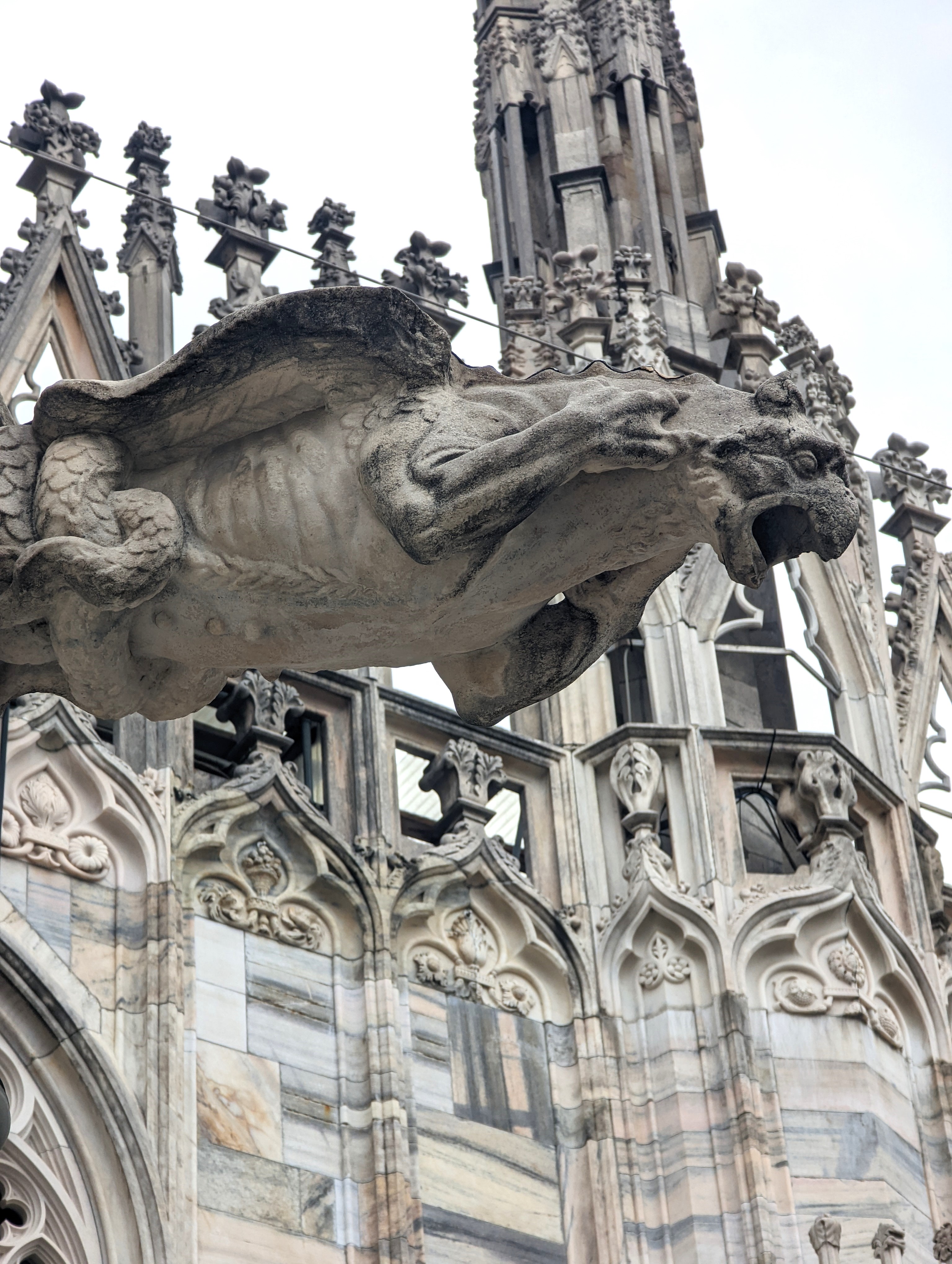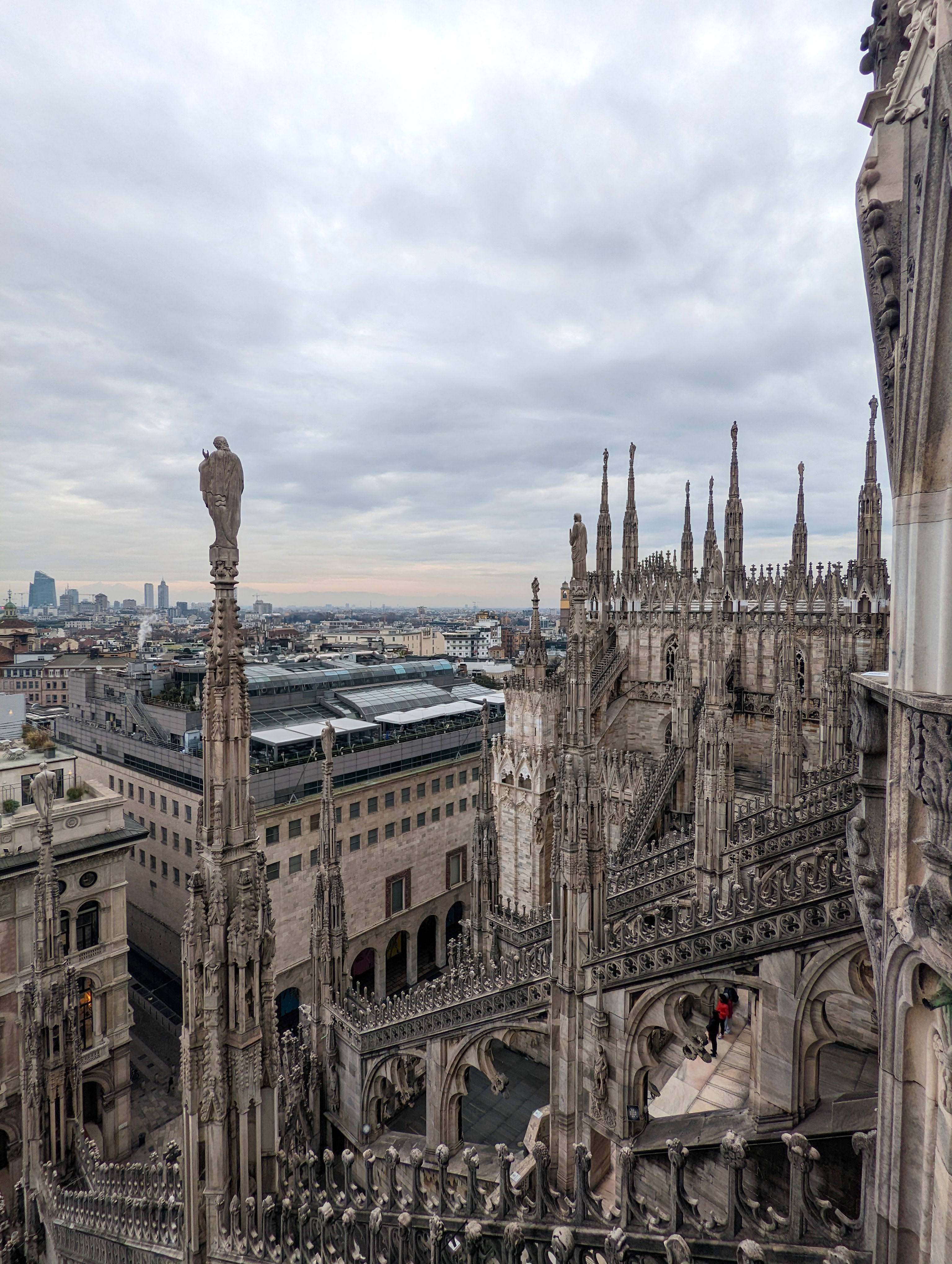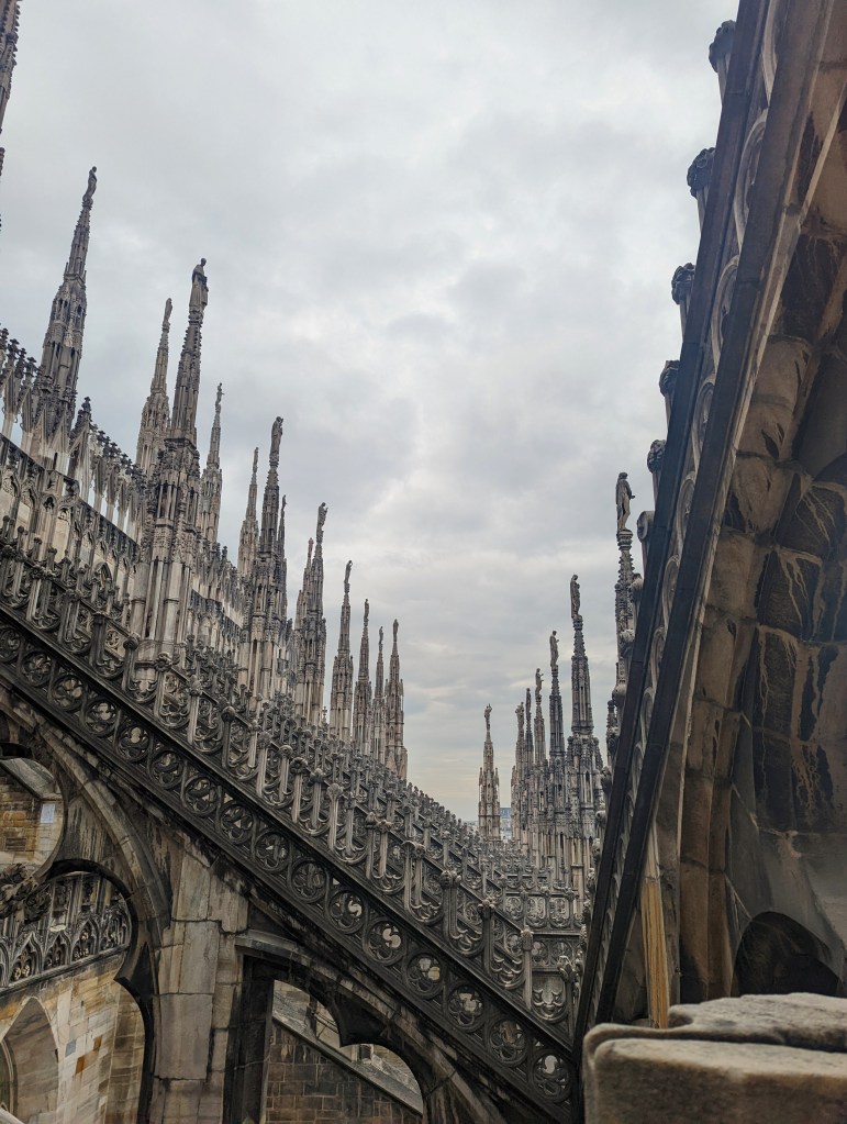 Comprámos os bilhetes através do site oficial https://www.duomomilano.it/en/ e escolhemos o Duoma Pass Stairs que nos deu acesso aos telhados (pelas escadas), à catedral, à zona arqueológica e ao museu. Cada bilhete ficou-nos a 15 euros. Marcámos para as 10 da manhã e no site aconselhava a chegar uns 15 minutos antes da hora marcada. Acredito que no Verão haja muita confusão, mas sendo Janeiro chegámos ainda uns minutos antes das 10 e entrámos logo de seguida. Começou-se a visita pelo telhado e a subida pelas escadas fez logo subir o batimento cardíaco. Já a suar em bica e a perguntar-nos porque não tínhamos dado mais 5 euros para subir de elevador chegámos finalmente ao cimo. Primeira impressão da catedral? Horrível, horrível (sarcasm alert!) – muitos pináculos e santos e rendilhados. Detestei tanto que tenho cerca de 50 fotografias a comprovar o quanto não vale a pena. É que nem sabia para onde me virar com toda coisa feia.