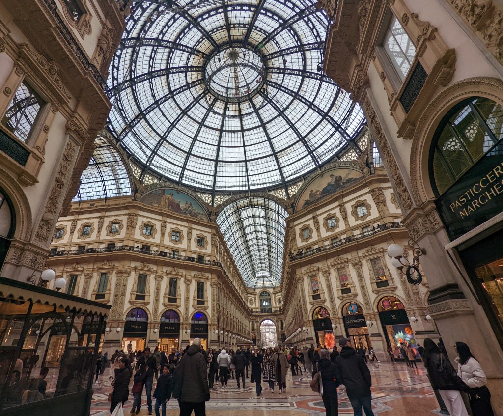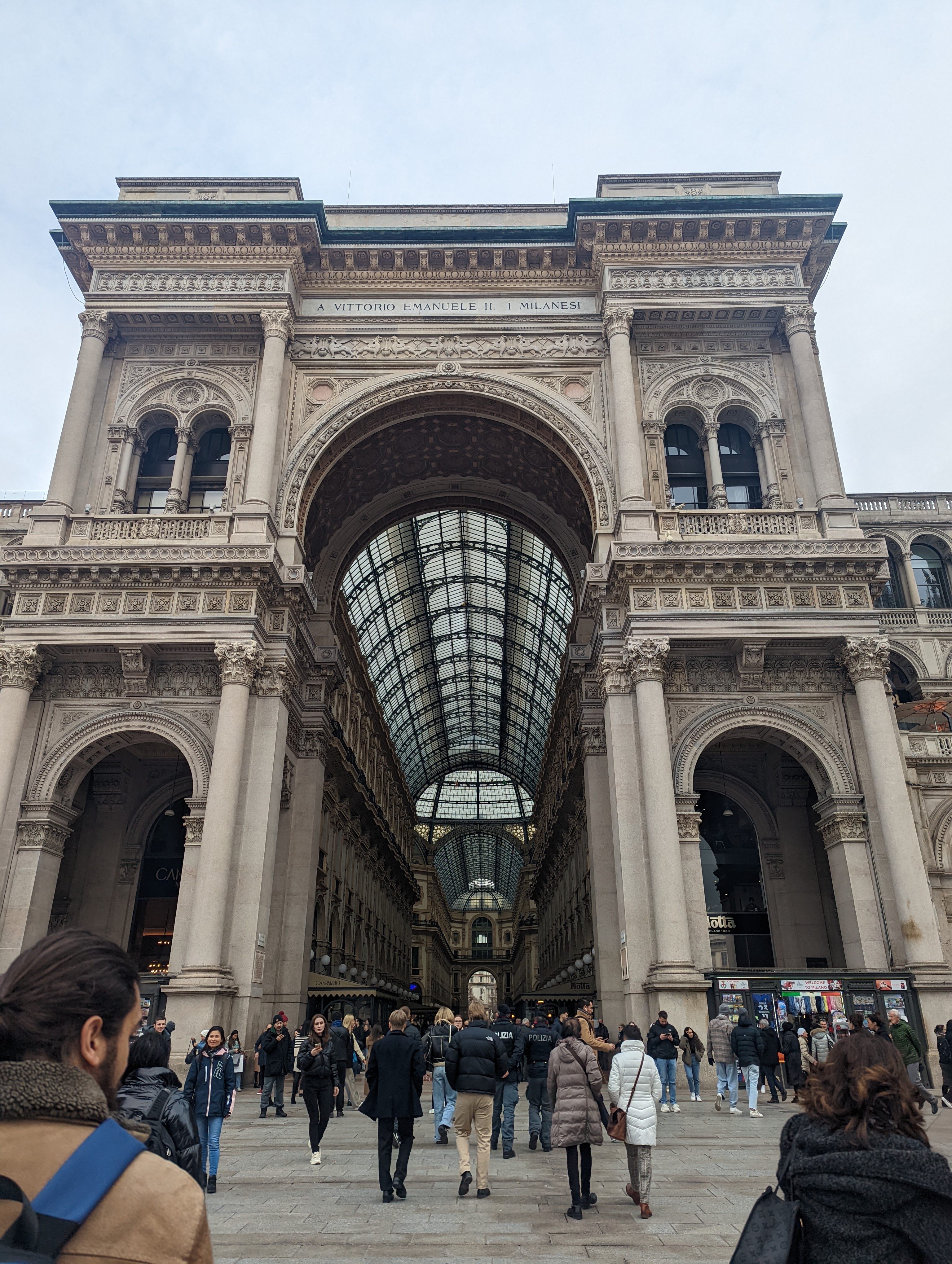 Depois de umas duas horas a explorar todas as secções do Duomo incluindo a zona arqueológica e o museu, este último fica ao pé do Palácio Real, fomos confirmar que aquela cidade era para diferentes tipos de bolsos. Galleria Vittoria Emanuele II, arcadas que vos levam a passar por diferentes lojas. Em algumas há um empregado que te abre a porta, não aquele segurança que está sentado a olhar para o telefone ou que não tens bem a certeza se morreu de tédio ou se só adormeceu – não! São empregados de fato a abrirem-te a porta. Nomes como Gucci, Louis Vitton, Prada são apenas alguns dos mais conhecidos que habitam nestas galerias.