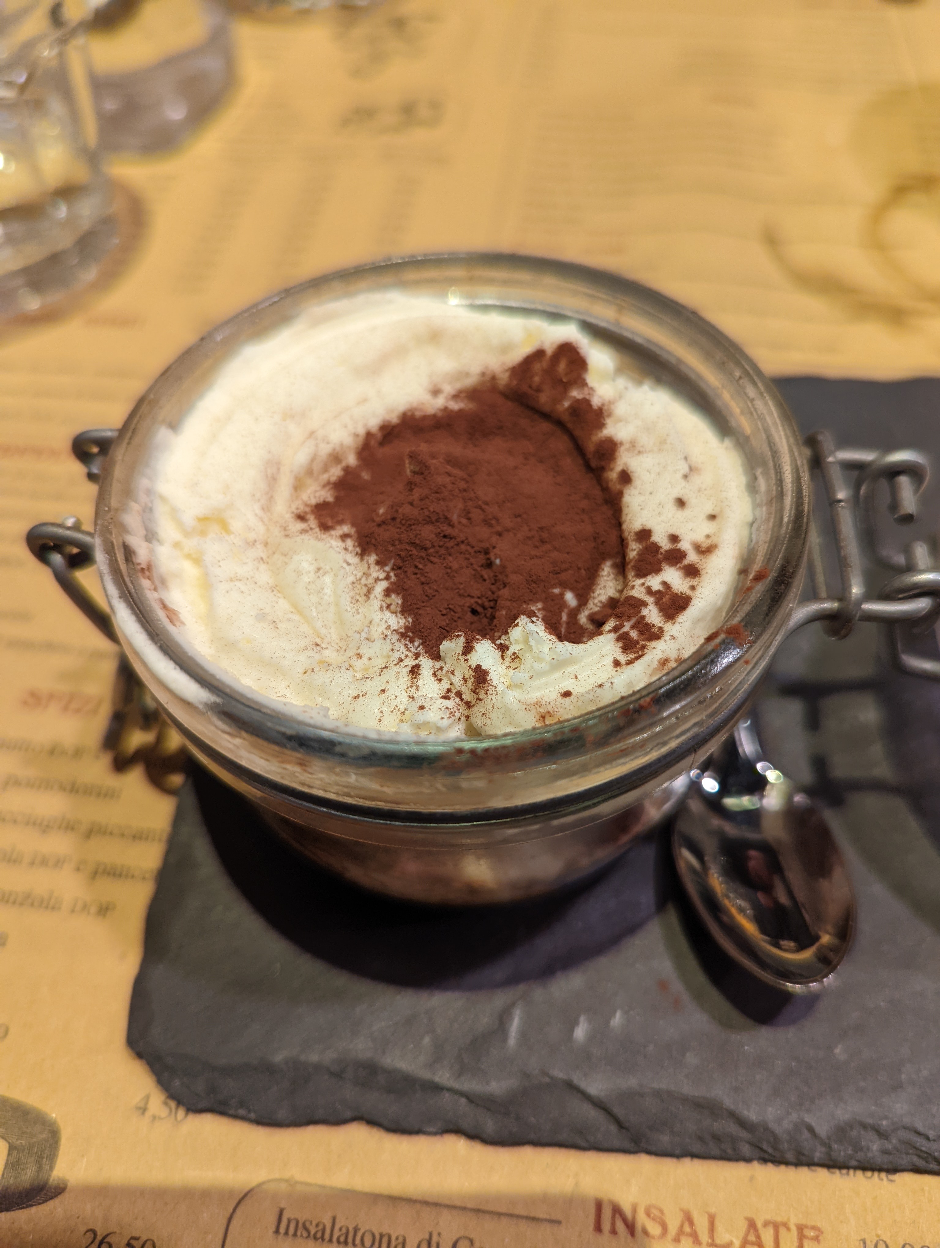 Para entrada pedimos polenta frita com presunto e queijo. E, entretanto, trouxeram um cesto de pão com manteiga de alho e queijo e um molho com pimentos. Quando trouxeram o pão e os molhos disseram que eram oferta da casa, mas não se iludam, nada que vem para a mesa num restaurante italiano é oferta. E mesmo o que não vem para a mesa vem na conta no final. Quando fizemos o pedido, o meu marido pediu uma cerveja que nunca apareceu, pediu outra vez quando veio o prato principal e também nunca apareceu. No entanto, na conta já apareceram duas cervejas. Dissemos à empregada que não tinha vindo nenhuma cerveja, veio a conta só com uma cerveja para pagar. E lá tivemos que dizer outra vez que não tinha vindo nenhuma cerveja. Este deve ser o estratagema para apanhar os mais introvertidos que não vão dizer nada para “não parecer mal”. Agora sobre a comida – o presunto e o queijo, muito bom, a polenta, talvez se o rácio fosse mais polenta e menos óleo a coisa tinha sido melhor. A polenta vinha tão empapada que mais parecia pronta para olear um carro. Talvez se viesse debaixo de um papel absorvente em vez de papel de embrulho o óleo conseguisse escapar por algum lado em vez de bloquear veias. Para entrada principal pedimos gnocchi com molho de quejo gorgonzola e tagliatelle com molho de carne. Se eram maus? Não, não eram. Se já comi melhor? Sim, e não tive de ir a Itália. Por isso ficou assim um bocado aquém, mas o fator principal aqui foi a grande expectativa com que íamos, eu estava completamente convencida que ia ficar completamente de boca aberta e viciada em massas e pizzas. Ainda fomos para a sobremesa, tiramisu, e sim era a receita tradicional com mascarpone e café forte. Foi um dos pontos altos da refeição, mas também só por acaso custava quase tanto como um prato principal. Não quero que fiquem com a ideia que o restaurante era mau. Não era de todo, e mesmo o ambiente era descontraído e animado. E se voltava aqui? Depois de tudo em conjunto sim, voltava, especialmente para experimentar a salada com burrata.