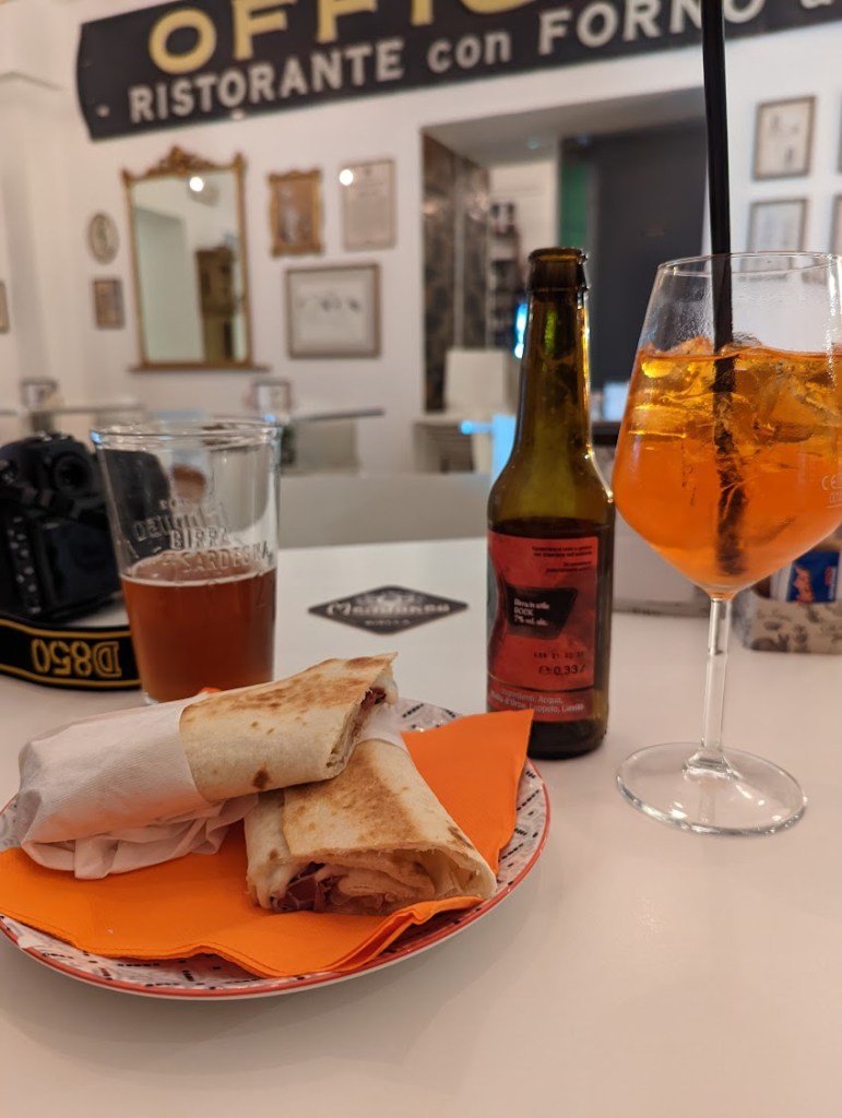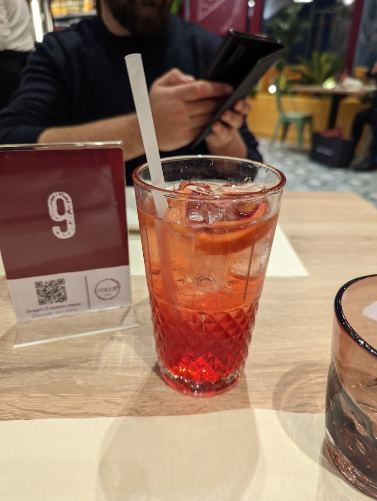 Saímos da sala já de noite e com um frio de fazer bater dentes como castanholas (desculpem, país errado para a referência usada). Para jantar já sabíamos onde queríamos ir – Salsamenteria di Parma – restaurante italiano para finalmente provarmos um pouco mais desta cozinha que é conhecida e apreciada mundialmente. Não tínhamos marcado mesa, mas chegámos cedo, por volta das 7. Se quiserem jantar mais tarde aconselho a marcarem mesa porque passados uns 10-15 minutos depois de chegarmos as mesas já estavam completas e só aceitavam quem tinha feito marcação. O menu ao início pareceu-nos um bocado confuso, primeiro há as entradas e depois aconselham a escolher primeiro prato, um prato de massa, e depois um segundo prato como prato principal. A mim pareceu-me um bocado “tourist trap”, um menu feito para turistas. Nós escolhemos entrada e um prato para prato principal. Para beber, estando em Itália, não há nada como pedir um Aperol Spritz e confirmo que em Itália este cocktail sabe melhor. No final da viagem, bebemos Aperol em 3 estabelecimentos e todos eles sabiam ligeiramente diferente, mas mesmo assim todos eles eram melhores dos que já tinha bebido em outras ocasiões.