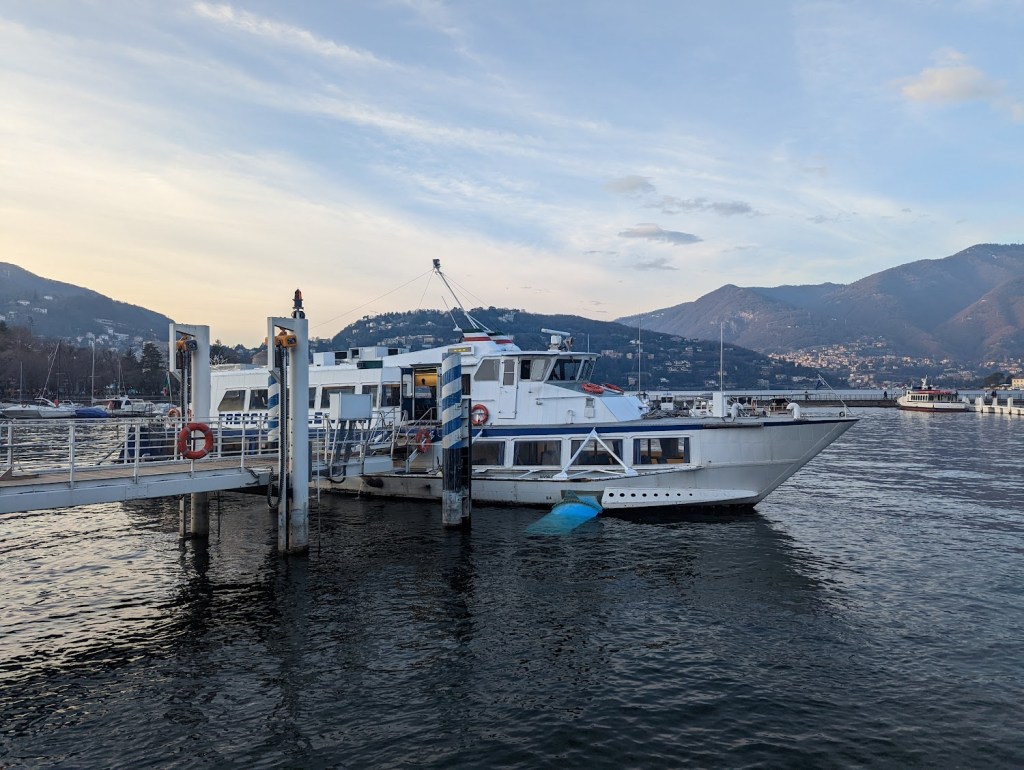 Às 15:11 fomos a correr para apanhar o barco – e a única opção já não era ferry, mas o barco de serviço rápido. O bilhete já ficou a 14 euros cada pessoa mas vão num barco que anda tão rápido que vai fora de água. Não estou a brincar, a parte da frente do barco vai no ar. Este barco é fechado, mas não me importei, porque agora o frio dos Alpes começava a entranhar-se nos ossos. Demorámos quase uma hora de Menaggio a Como porque o barco vai parando em vários locais como em Varenna. Se preferirem podem fazer o percurso contrário, apanhar o comboio em Milão para Como e depois subir o lago até Varenna e então aí apanhar o comboio de volta.