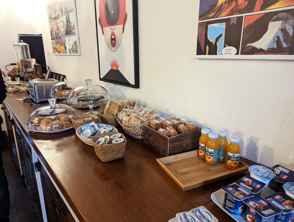 A zona era calma, apesar de ser perto de linhas ferroviárias, mas nada a dizer. O tamanho do quarto foi uma agradável surpresa. O pequeno-almoço era simples. Não digo que era mau, não era, mas simples. Alguns cereais (o leite ainda estamos a tentar perceber onde estava), fatias de pão, panetone (um bolo tradicional com frutas cristalizadas, surpreendente bom), iogurtes, manteiga e uns queijos, fiambre e mortadela. Chegou para aquilo que precisávamos, mas não foi algo que tenha ficado para a história. Descobri que em Itália o melhor é a charcutaria – o fiambre, o presunto, a mortadela eram deliciosos, tinha um sabor intenso mas muito bom. Vou atirar-me e dizer que foi o melhor de toda a viagem. No pequeno-almoço havia sempre a opção de café, cappuccino ou chá – o cappuccino era bom e havia uma boa variedade de chás.