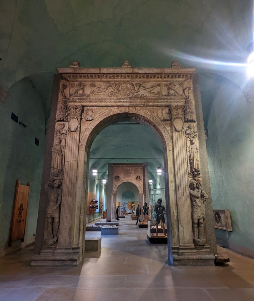 Assim de malas em mãos fomos visitar o castelo. Apesar de não ter sido planeado a coisa até que não correu mal. Passo a explicar – como em todos os museus não se pode entrar com malas, deixámo-las nos cacifos do museu até à hora de ir para o aeroporto. Para chegar ao castelo da Casa Calicantus passámos pelo Arco della Pace e pelo parque Sempione, onde se encontra a arena cívica Gianni Brera, local onde se realiza jogos de futebol e provas de atletismo. Também neste parque se pode visitar o Acquario Civico e Stazione Idrobiologica di Milano. Nós apenas passeámos pelo parque onde se encontrou muita gente a correr, mas mesmo muita gente com força de vontade para sair de casa às 9 da manha no meio de um frio congelante. E pior, isto notou-se tanto no Sábado como no Domingo. Só pode ser dos hidratos de carbono das massas e pizzas que dão energias extra para estas brincadeiras.