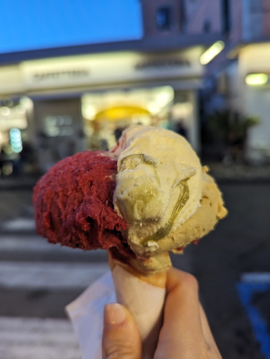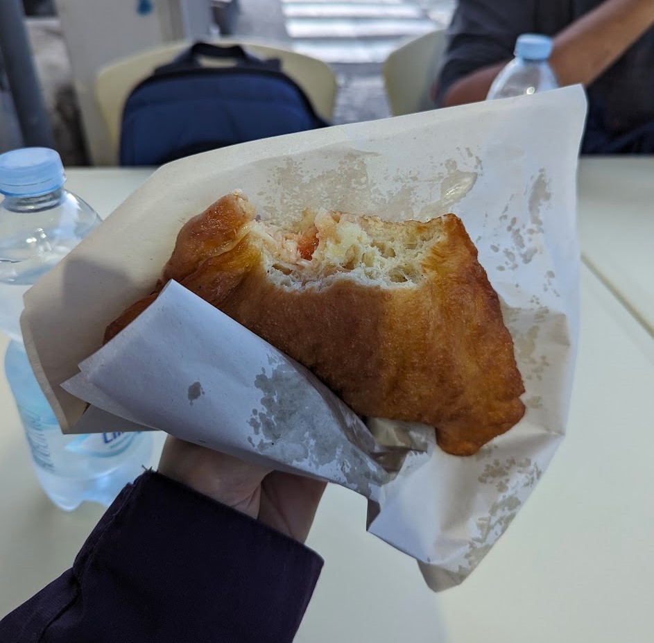 Agora em relação à comida! Para almoçar queríamos uma coisa rápida e Nápoles é conhecida pela sua tradicional comida de rua (street food). Como podem imaginar eu tinha uma grande lista de comidas que queria experimentar – e, apesar de não ter dado para tudo, começámos o almoço com uma pizza frita. Aviso já que a comida de Nápoles não é para um coração fraco. Mas anda-se muito, por isso quase que um contrabalança o outro. A comida é deliciosa e mesmo o que soa menos bom é delicioso como acabou por ser a pizza frita num estabelecimento mesmo em frente de uma das entradas para a antiga cidade de Pompeia, ‘Pizzeria da zio Carmine di fagà Adolfo e Paolo‘. Itália consegue o subtil sucesso que é a pizza frita o que não foi bem-sucedido durante a nossa estadia na Escócia cuja experiência não consistiu só em pizza (congelada) frita, mas também em Mars frito. Não se pode comparar experiências. A Escócia que se deixe estar com o seu black pudding e haggis. Para acabar fomos provar um gelado à pastelaria De Vivo, mas ficámos meio desapontados. Apesar do bom aspeto os gelados não eram nada de especial, aliás um dos gelados nem sequer muito sabor tinha. Uma pena, pois a expectative era enorme.