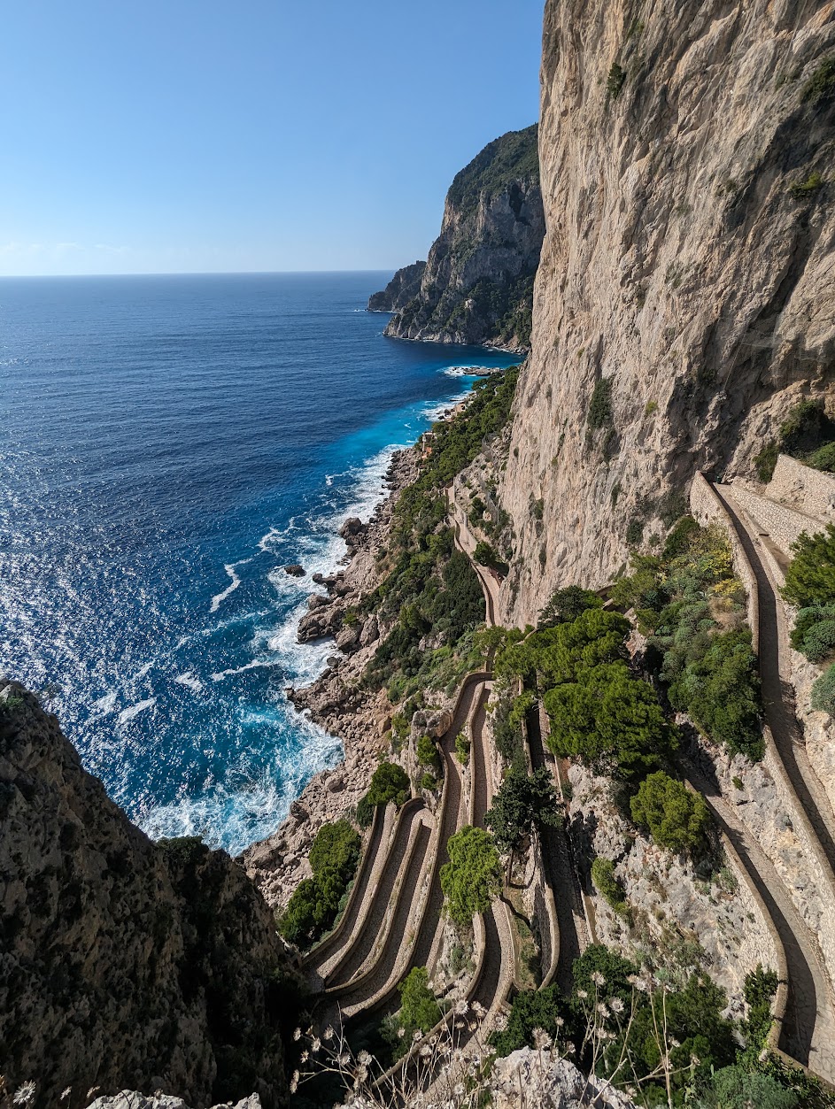 No dia seguinte, depois de uma noite bem repousada, e de um bom pequeno-almoço, decidimos que para explorarmos um pouco da ilha íamos a pé de Anacapri até Marina Grande. Ainda se demora cerca de 1 hora e pouco de Anacapri mas tivemos assim oportunidade de parar em pontos panorâmicos e descer a famosa Scala Fenicia com os seus 921 degraus que até o século XIX era a única maneira de chegar a Anacapri por terra.