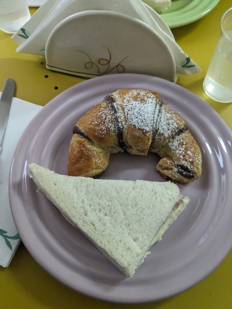 No dia seguinte fomos tomar o pequeno-almoço cedo para apanhar o ferry para Capri (o que aconteceu muito mais tarde do que esperávamos – ver secção sobre Capri) mas também não dava para dormir. Sendo o quarto virado para a Via Casanova o barulho era tremendo. Toda a noite os carros e scooters não pararam de apitar. Não faço ideia como as pessoas vivem ali, ou furam os tímpanos de desespero ou usam uns super tampões. É impossível aquela lengalenga do ‘depois de um tempo já nem noto’ porque o barulho é constante e verdadeiramente maçador. O pequeno-almoço não foi mau, havia umas sandes de fiambre e de salame com maionese, que apesar de não soar apetecível para pequeno-almoço atingiu o ponto. Com um croissant de chocolate para adicionar extra energia estava na hora de abalarmos.
