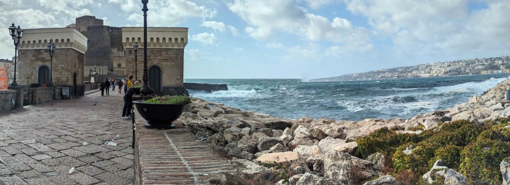 Saímos então do B&B e pusemo-nos a andar pela cidade desde a Via Casanova até ao porto. Foram cerca de 45 minutos a andar bem, mas deu para conhecer outras zonas da cidade como por exemplo o monumento Vittorio Emanuele II e o Palazzo dell’Immacolatella. Depois de nos dizerem que o ferry das 9 estava cancelado e para voltar a verificar mais tarde, por volta das 11 e meia, decidimos explorar a zona de Nápoles agora junto da costa. Começámos pelo castelo mais perto, o Castel Nuovo que naquele dia se encontrava fechado. Tirámos as fotografias ao seu imponente exterior e seguimos pelo jardim ‘Giardini del Molosiglio‘, onde se têm uma bonita vista da costa napolitana. Continuando pela costa fomos até ao Castel dell’Ovo, mas estava tanto vento que os pingos vindos das ondas do mar chegavam até nós. Este castelo também se encontrava encerrado para visitas. O porquê de estes castelos estarem encerrados não soubemos na altura, mas também não tínhamos muito tempo para entrar e os explorar como deve ser. Mas aconselho o passeio pela costa independentemente se acabarem ou não por visitar algum dos castelos, ou outros edifícios como o palácio real ou o teatro de São Carlos.