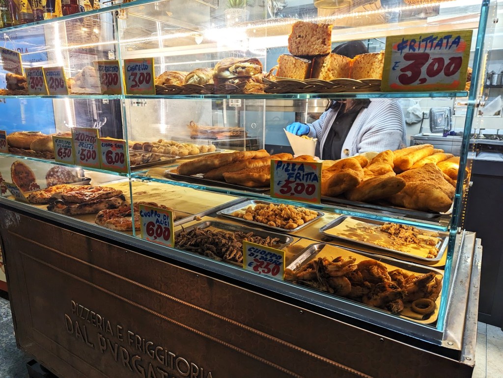 Sendo a nossa última noite em Nápoles tínhamos que escolher da nossa longa lista de comidas o que queríamos ainda experimentar. Uma das coisas que não queríamos perder eram os cones – ‘cuoppo’. Talvez os mais conhecidos são os de peixe (di mare) que incluem camarão, lulas, mexilhão e anchovas. Também há o cuoppo di terra com croquetes, arroz, curgete. E depois existem várias variações. Tudo isto é frito, por isso não esperem uma coisa leve para o coração. Nós comemos o cuoppo di mare na Pizzeria e Friggitoria Del Purgatorio. E gostámos bastante, eu apesar de estar um bocado receosa dos peixinhos, acabei por gostar imenso. E um cuoppo deu bem para os dois, já que isto não era o jantar apenas a entrada. E aproveito para mostrar na imagem abaixo a característica oferta da comida de rua em Nápoles que inclui pizza frita (que experimentámos em Pompeia), frittata (que nunca chegámos a experimentar) e a pizza portafoglio.