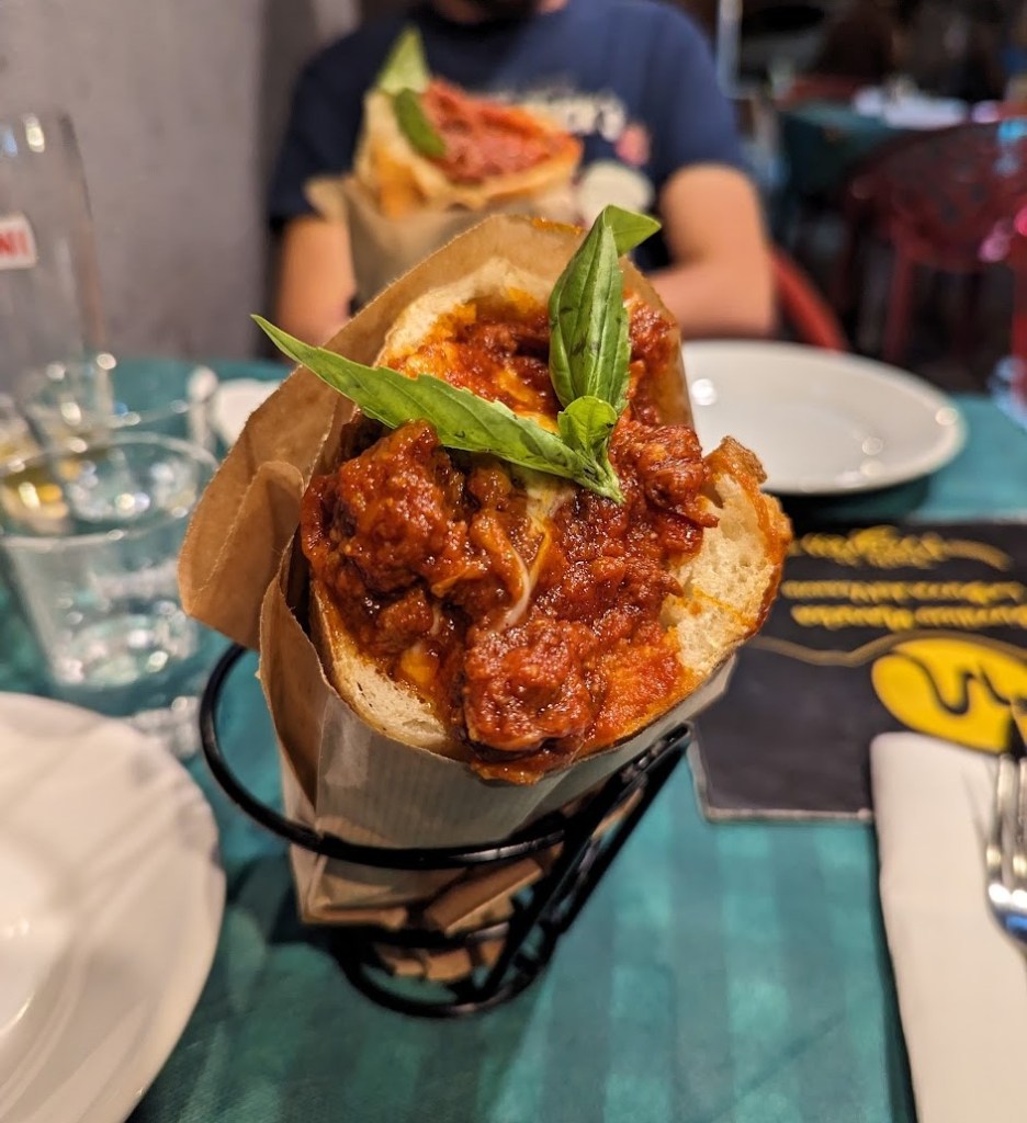 Para jantar fomos ao restaurante Tandem para comer o famoso ragù napolitano, que na sua essência é carne com um molho de base de tomate muito saboroso. Nós pedimos a sandes de ragù chamada de Cuzetiello mas o pão era um bocadinho rijo demais, por isso aconselho a provarem o ragù mas com massa ou gnocchi. No entanto, não deixem de provar o ragù. Existem vários restaurantes da cadeia Tandem espalhados pela cidade de Nápoles, basta encontrarem o mais perto. Nós não tínhamos feito reserva mas sendo uma segunda-feira à noite o restaurante não estava movimentado e rapidamente arranjámos mesa.