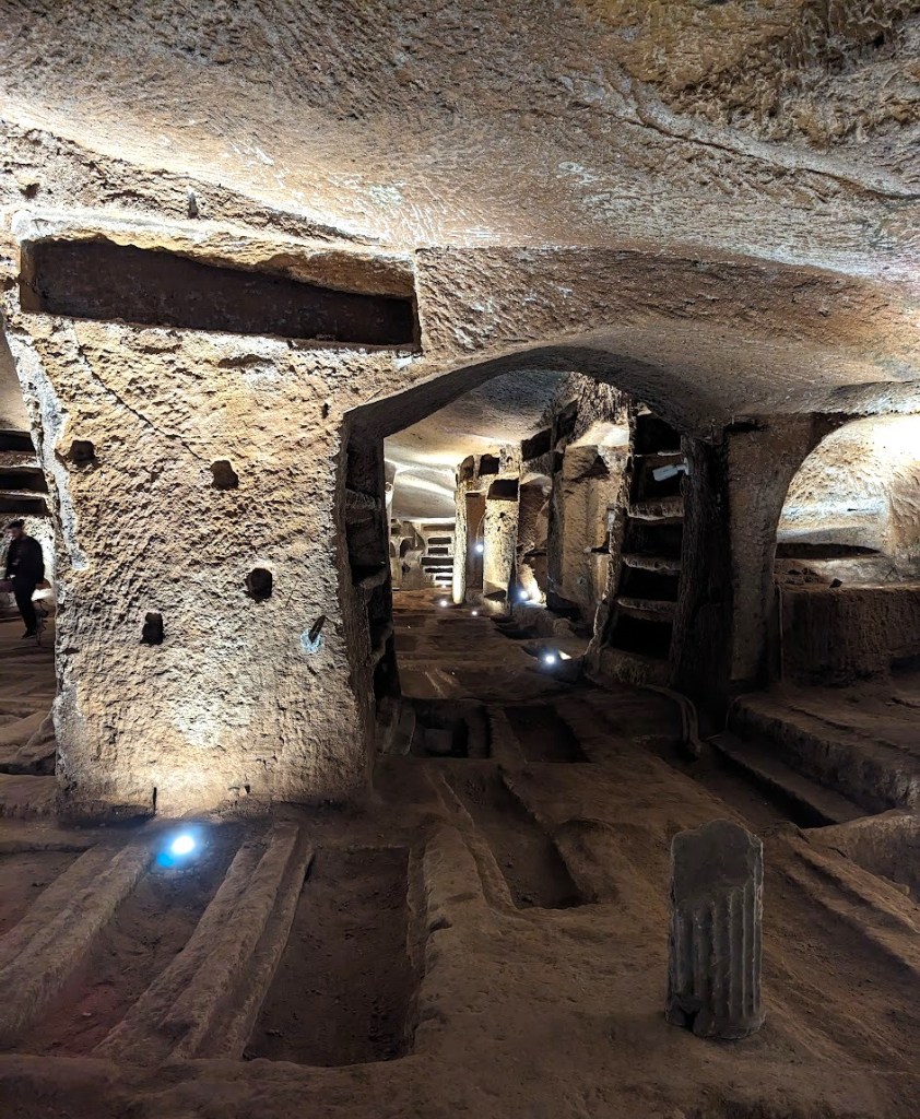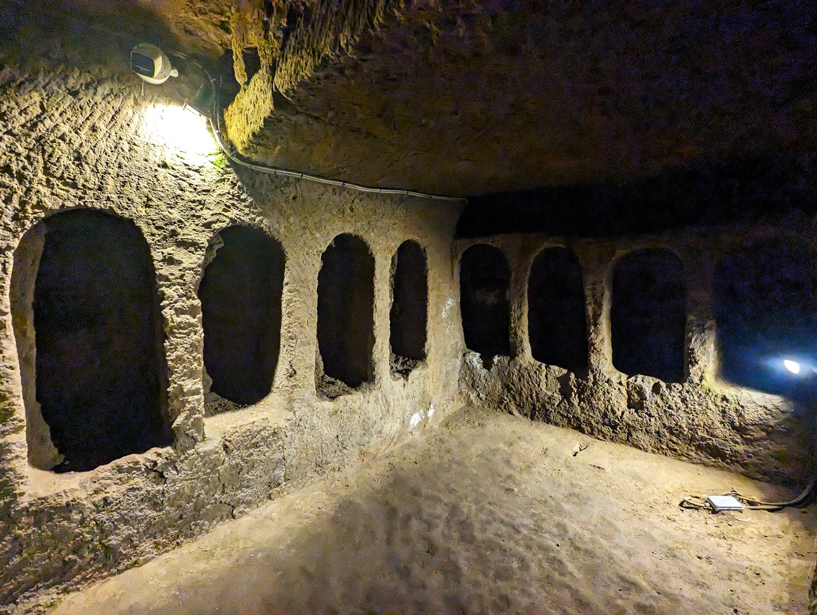 Durante a noite tivemos uma luta à procura de uma melga mas sem barulho constante das buzinas o que foi um plus depois da nossa última noite em Nápoles na Via Casanova. De manhã tomámos um pequeno-almoço leve no B&B e partimos para as nossas últimas horas em Nápoles. Havia dois sítios que queríamos visitar, duas catacumbas, e descobrimos depois que na compra do bilhete para uma delas se pode visitar a outra sem valor acrescido. Esta oferta ou promoção tem uma validade de um ano se não conseguirem visitar os dois locais no mesmo dia. Começámos pelas catacumbas di San Gaudioso. Estas encontram-se no Quarteirão Stella, que há cerca de 10 anos era uma das zonas mais perigosas da cidade e um grande foco da máfia italiana, a Camorra. Isto mesmo nos foi explicado durante a tour. Sim, porque para visitar tanto umas catacumbas como as outras, é obrigatório participar numa tour com guia. Ambas as catacumbas são propriedade do Vaticano e portanto não é permitido filmar.