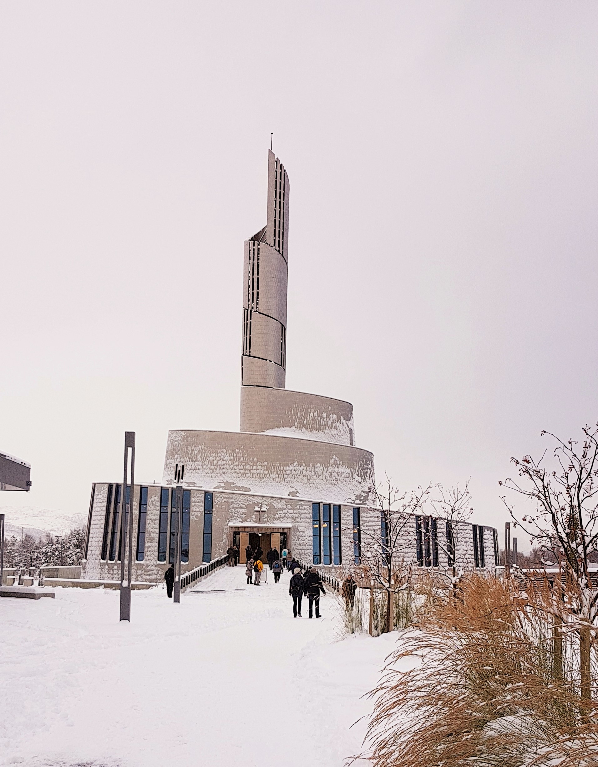 Durante o dia aproveitámos para visitar o centro da cidade. Alta não é muito grande mas é uma cidade amorosa e pacata. Aproveitámos e visitámos a Catedral das Luzes do Norte (The Northern Lights Cathedral). A igreja foi construída em betão revestida exteriormente por chapas de titânio. A parede do altar foi tratada com esmalte azul de forma a acentuar a figura de Cristo. A sala interior também foi construída em betão e o chão em carvalho maciço. As paredes medem 800 metros onde foram afixadas lâmpadas LED o que proporciona uma atmosfera quente, confortável e de luz, e com boas qualidades acústicas. O nome original – Northern Lights Cathedral Alta Church – foi escolhido em 11 de Abril de 2012. O termo “Northern Lights Cathedral” tornou-se o título de trabalho desta nova igreja em 1999, altura que Alta se reclassificou como “a cidade das Luzes do Norte”.