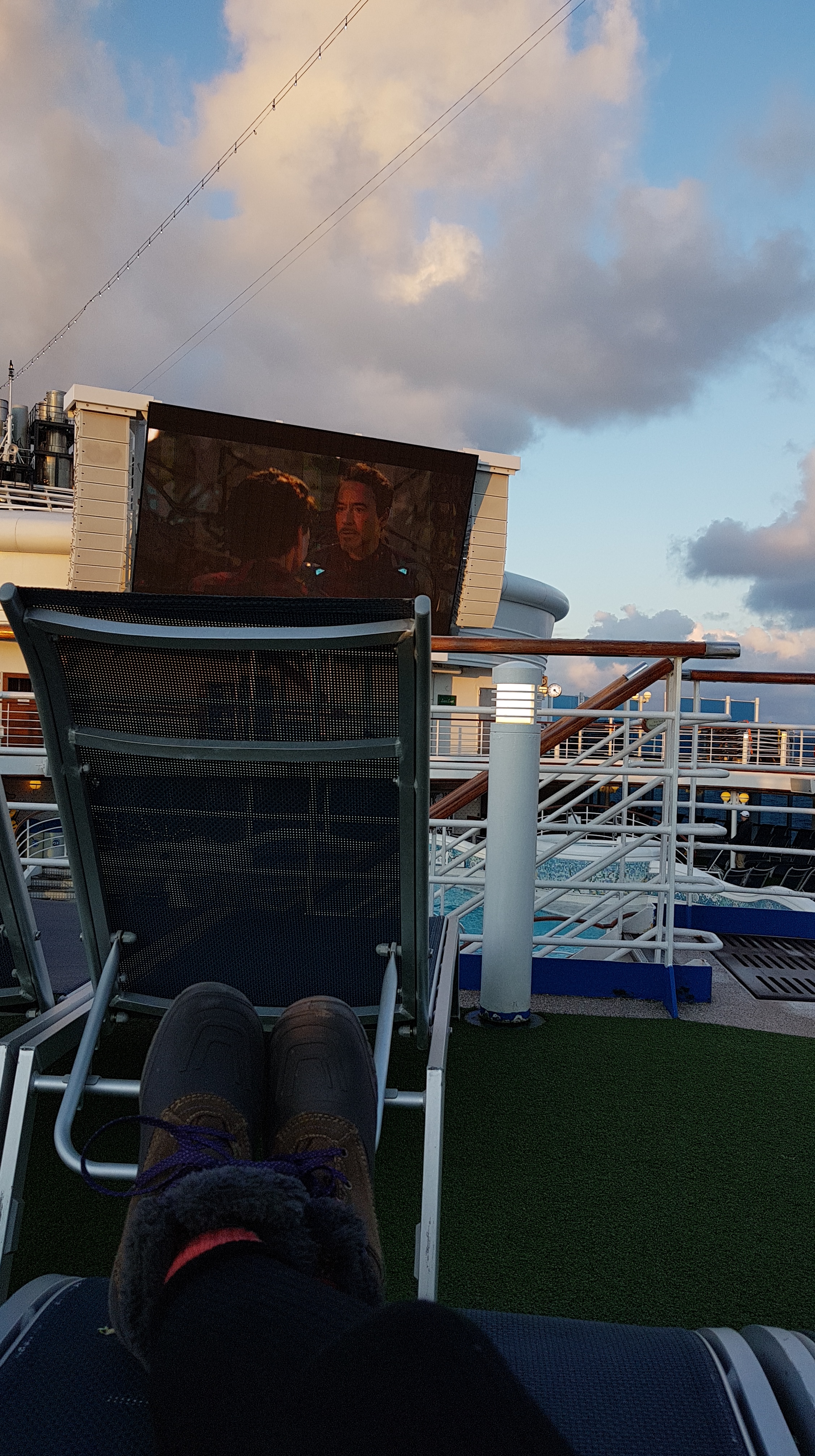 - “Movie Under the Stars” – um enorme ecrã de televisão na parte exterior do barco, na zona das piscinas e dos jacuzzis. Passavam 3 filmes todos os dias, de manhã, à tarde e à noite, sempre diferentes. É simplesmente maravilhoso podermos estar dentro de água quente (especialmente quando estava tanto frio “na rua”) a ver um filme. Eu pessoalmente adorei.