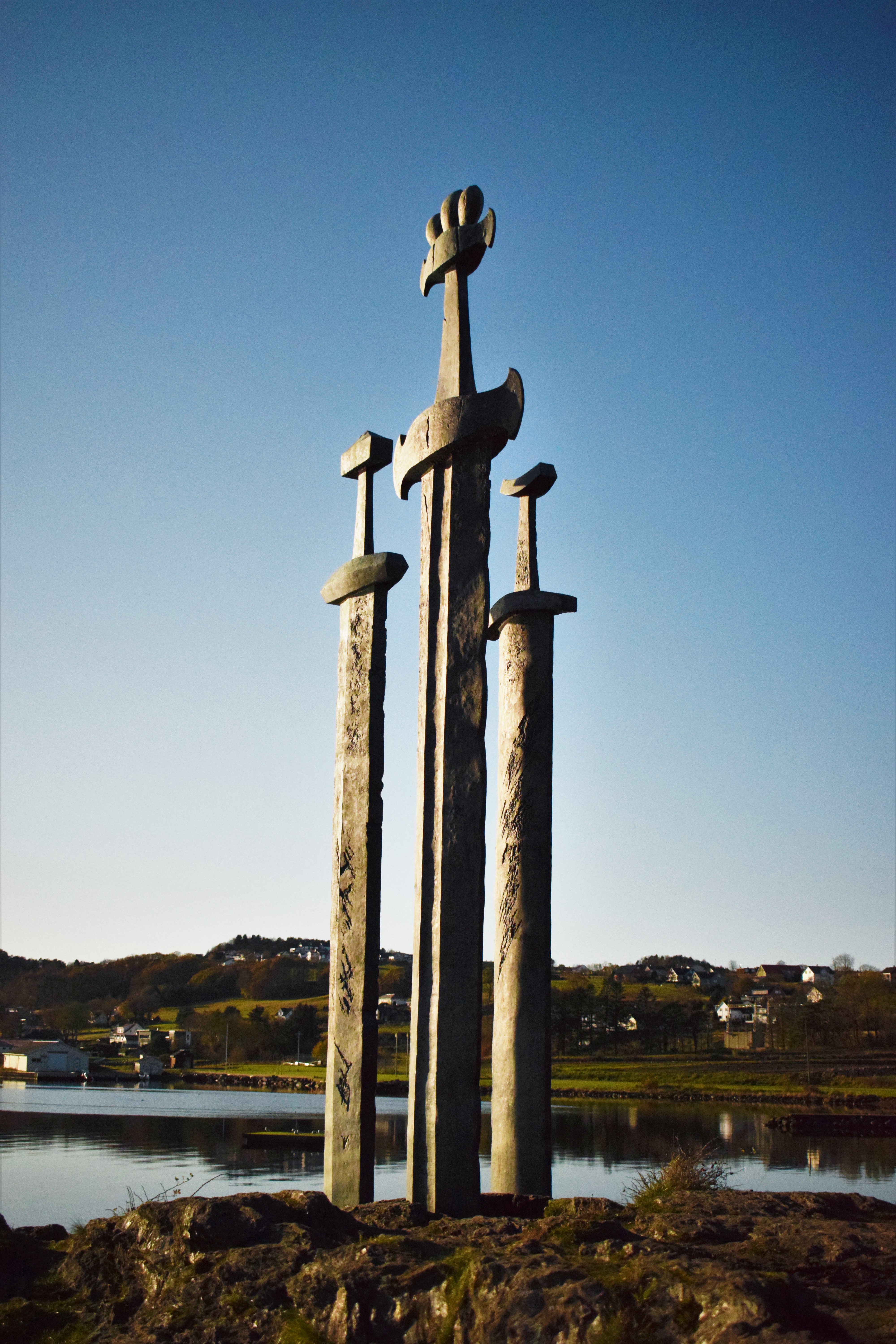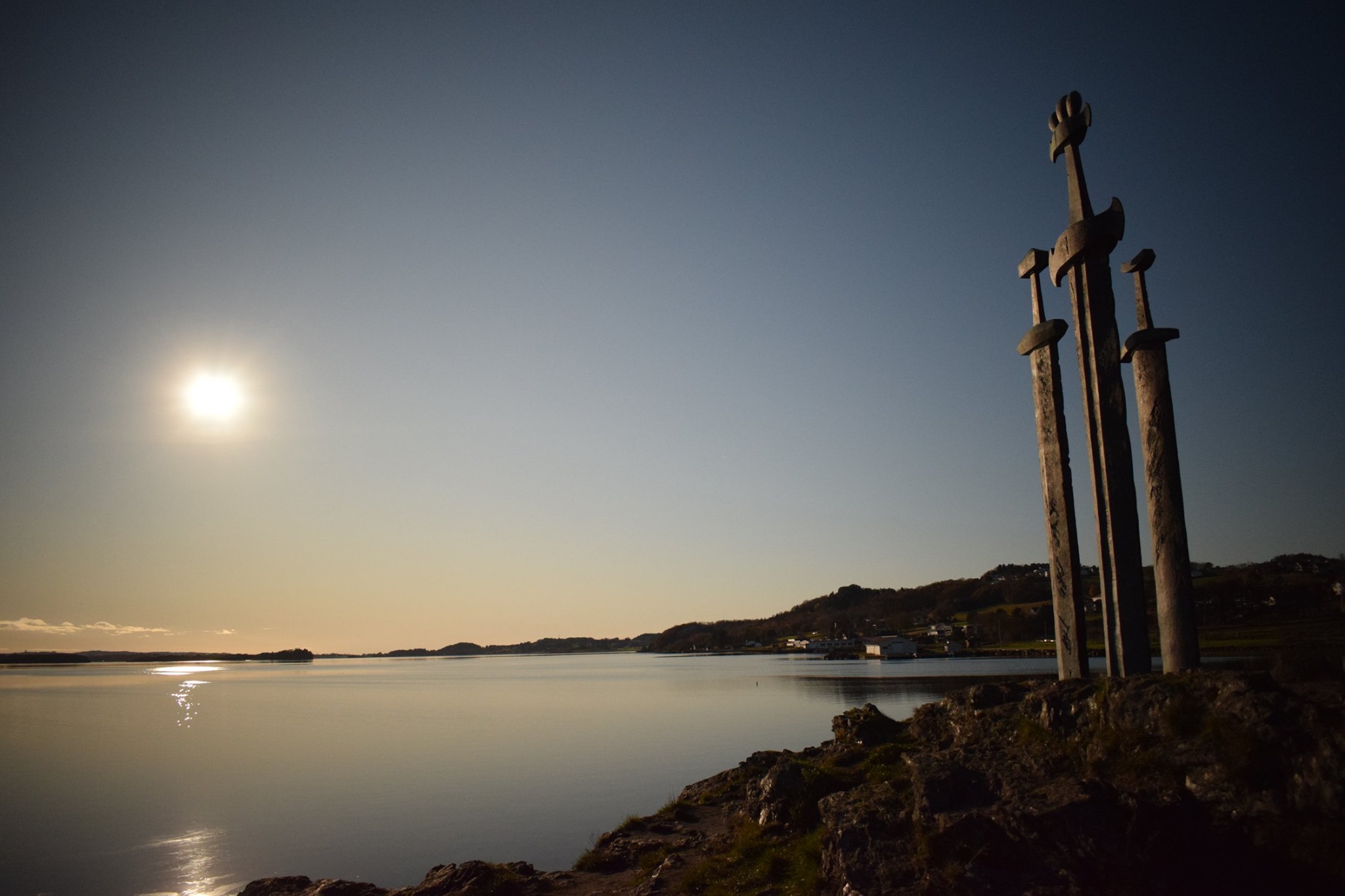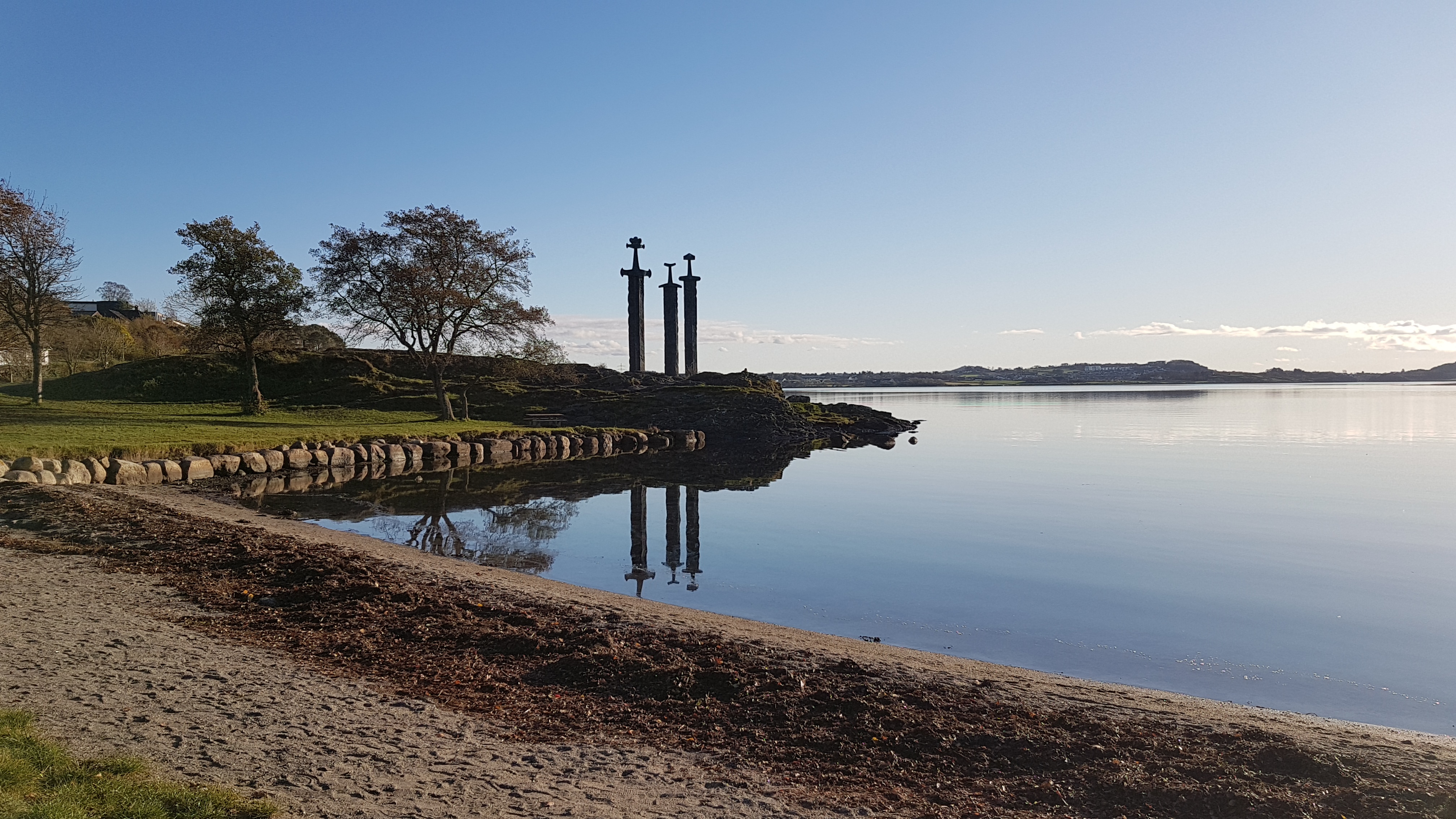 Em seguida partimos para Sverd i fjell (espadas na pedra), um monumento comemorativo da histórica batalha de Hafrsfjord que ocorreu no ano de 872, quando o rei Harold I reuniu toda a Noruega sob uma só coroa. O monumento consiste em três espadas de bronze com 10 metros de altura que estão enterradas na rocha de uma pequena colina da margem oposta à cidade de Stavanger. Andámos cerca de 1 hora para cada lado mas valeu a pena, aquela zona era lindíssima.