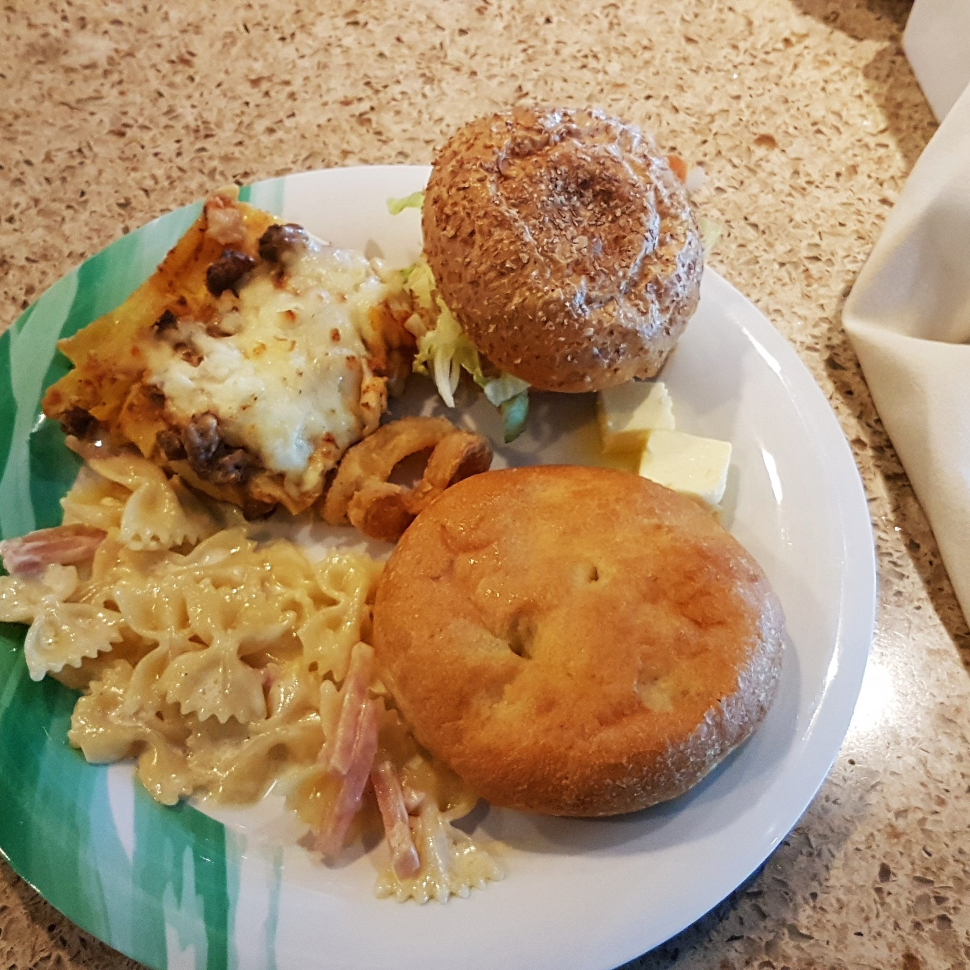 Quando reservámos o cruzeiro marcámos o “Anytime Dining“. Este pacote permite jantar em 3 diferentes restaurantes, apesar do menu ser igual entre eles mas diferente todos os dias, desde as 5 e meia até as 9 e meia. Houve dias em que fomos jantar nas horas mais movimentadas e tivemos que esperar por mesa mas nunca foi mais que 10 minutos. Também tínhamos acesso ao buffett que se encontrava aberto desde as 5 e meia da manhã até às 10 e meia da noite, onde a maior parte das vezes almoçámos e tomámos o pequeno-almoço. Havia também um café que estava aberto 24 horas. Incluído tínhamos serviço de quarto 24 horas, mas nunca o usámos. Pessoalmente preferi a comida dos restaurantes ao do buffet, mas por vezes soube-nos bem estar num ambiente mais informal, já que para ir aos restaurantes requer um certo cuidado na roupa que se veste.