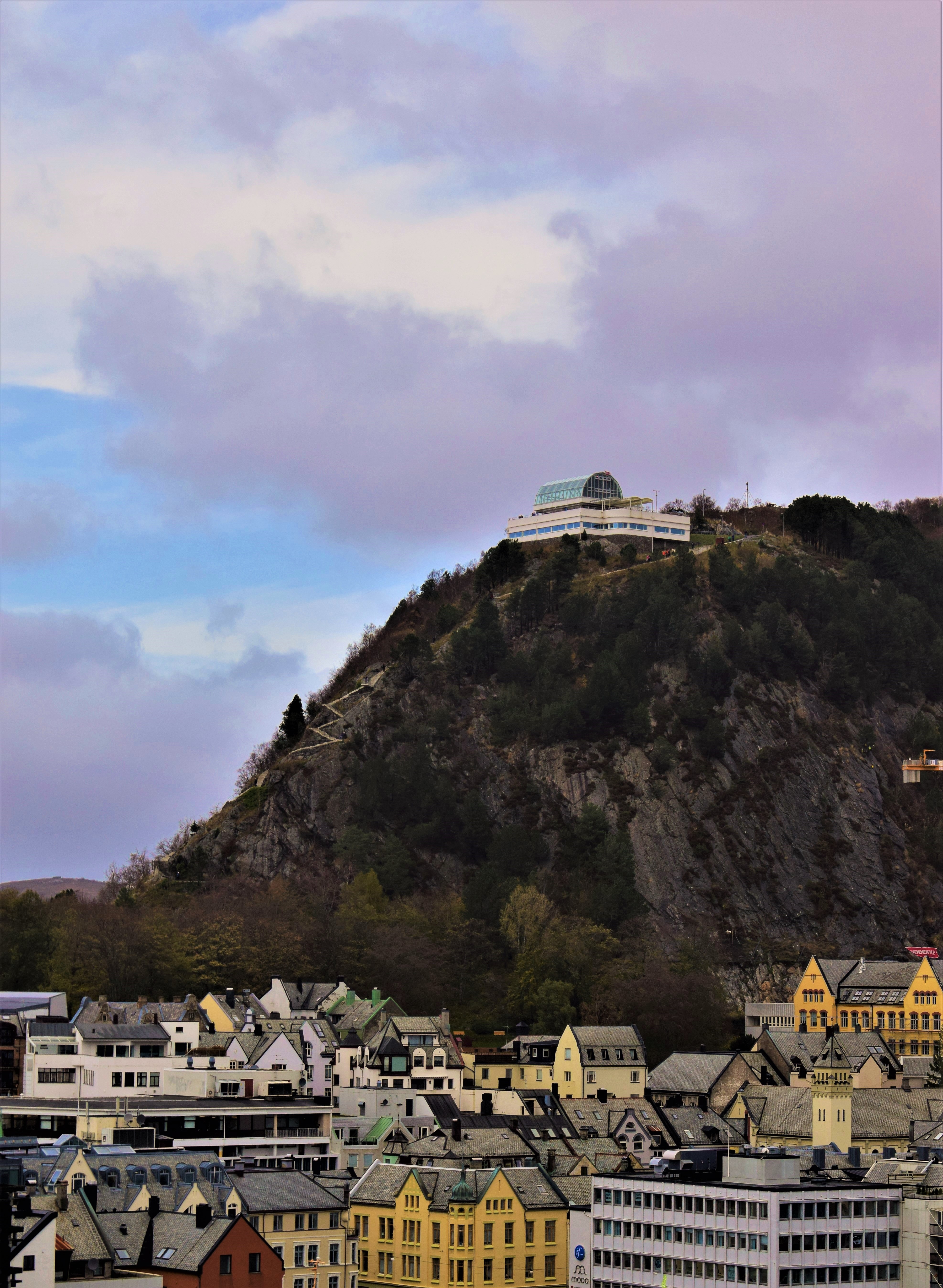 No cimo deste monte têm-se a mais fantástica paisagem de Ålesund e do arquipélago rodeado pelos majestosos Sunnmore Alps. É possível chegar a este panorâmico ponto tanto de autocarro como subindo a montanha a pé.