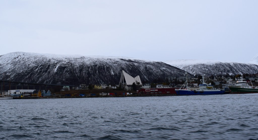 Quando atravessámos a cidade foi-nos apontado a bonita Catedral do Árctico, apesar de infelizmente não termos tido oportunidade de a visitar. Foi nos também explicado um interessante facto da cultura norueguesa nesta parte da Noruega. Quando passámos pelas ruas de Tromsø reparámos que várias casas tinham lâmpadas coladas ao vidros das janelas ou pelo menos candeeiros muito perto destas. Pelos vistos existe uma razão – a Noite Polar – fenómeno que ocorre durante 2 meses, em que não existe luz do Sol. Para tentar afastar a escuridão do exterior (como devem imaginar deve ser horrível não ver o Sol durante 2 meses seguidos), os noruegueses colocam estas lâmpadas nas janelas de forma a afastar a escuridão à volta da casa.