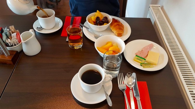 O primeiro dia, Sábado, começou cedo, pelo menos para os nossos padrões. Gente que gosta de dormir até ao meio-dia tudo que seja levantar antes das 9 é igual a espetar pregos nos olhos. O pequeno-almoço foi tomado às 9 da manhã e às 9 e meia estávamos prontos para ir apanhar o autocarro. O pequeno-almoço foi simples mas mais do que suficiente que para além do pequeno-almoço continental com cereais. queijos, fiambres e afins ainda comemos umas torradas com ovos mexidos. Como eu nunca tomo pequeno-almoço sem ser durante as férias, este é normalmente um dos momentos mais apreciados pela sua raridade. E sim, também é verdade que se acordo ao meio-dia não preciso de pequeno-almoço.
