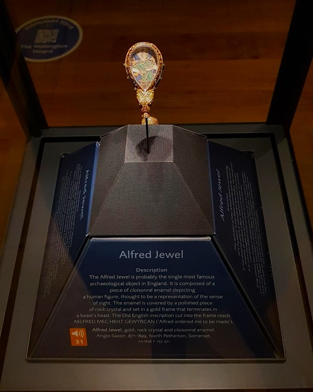 Uma das peças mais valiosas do museu é a jóia de Alfred (Alfredo em português). Este é talvez o objeto arqueológico mais famoso de Inglaterra. É composto por uma peça de esmalte cloisonnè onde está representada uma figura humana, o que se considera simbolizar o sentido da visão. O esmalte está coberto por uma peça polida de cristal e encaixado numa moldura plissada que se finaliza na cabeça de uma fera. A inscrição recortada na moldura está escrita em inglês antigo e lê-se “AELFRED MEC HEHT GEWYRCAN” (“Foi Alfred que ordenou que eu fosse feito”).