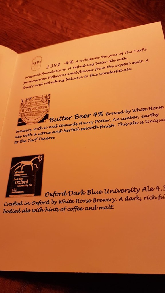 Depois de atravessar diferentes civilizações saímos para a rua onde já anoitecia (uma das maravilhas de viajar no Inverno) e com a escuridão vinha o frio cortante. Por isso ainda eram 4 da tarde quando nos sentámos numa mesa no Turf Tavern. E sim, quando o tempo está mau fica de noite às 3 e meia. E foi aqui que ficámos pela tarde fora. O Turf Tavern é um pub histórico de Oxford aberto desde 1381. Uma das paredes do pub é original da antiga muralha da cidade. O pub é principalmente frequentado por estudantes, o que confirmámos enquanto aqui estivemos, mas também foi palco de um recorde mundial em 1954 quando o primeiro-ministro australiano Bob Hawke bebeu 1.4L de cerveja em 11 segundos. Também era neste bar que o elenco e equipa de filmagens dos filmes Harry Potter costumava parar. Talvez seja por isso que têm ainda hoje no seu menu cerveja de manteiga (Butter Beer), uma das bebidas muito consumidas em Hogsmead. E quem não sabe onde é Hogsmead e a que se refere não merece respeito.