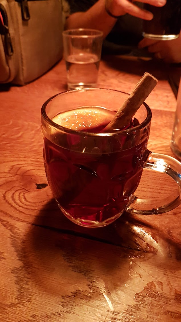 Acabámos por também jantar por aqui e para uma coisa mais ligeira, ou assim pensávamos, pedimos 3 entradas para partilhar. Pedimos halloumi, argolas de lulas e nachos. Tudo que nos apareceu à mesa era ótimo. E como estávamos em Inglaterra e fazia frio e chovia nada como um mulled wine para aquecer o espírito. Mulled wine é vinho aquecido com muitas especiarias como canela e anis. Eu sempre pensei que iria odiar a bebida, mas há nada melhor para uma noite fria. Quando me deram a definição de “sangria quente” torci o nariz, mas vale a pena experimentar e voltar a experimentar e experimentar mais umas vezes só para confirmar se gostam ou não.
