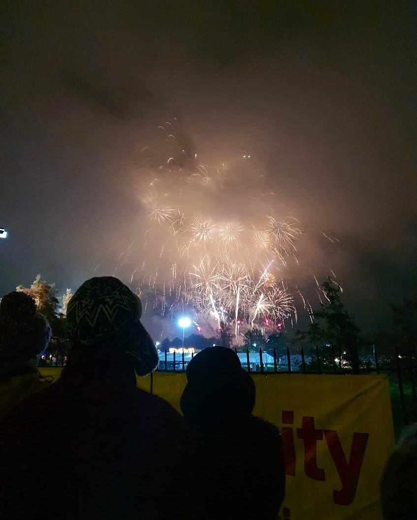 Neste dia celebrava-se algo especial em Inglaterra, Fawkes Night, também conhecida por Bonfire Night. Nesta noite celebra-se o facto de em 1605 se ter falhado a “conspiração da pólvora” que se focava em destruir o Parlamento e assassinar o rei James I. Nas cidades e vilas por toda a Inglaterra se celebra esta noite com fogo de artifício, música e comida. Em Oxford o melhor sítio para ver o fogo de artifício é no South Park (parque do Sul). O fogo de artifício estava marcado para as 7 e meia e eram já 7 quando nos pusemos a caminho. Mas tal como era esperado toda a população de Oxford em peso também quis ver o espetáculo. E, portanto, as ruas estavam cheias de gente, mais ainda perto do parque. Chegámos ao local já eram 7 e meia e apesar de não termos visto o espetáculo inteiro ainda conseguimos ver parte do fogo incluindo tirar uma fotografias para a posterioridade.