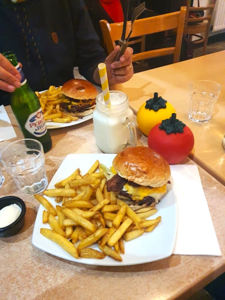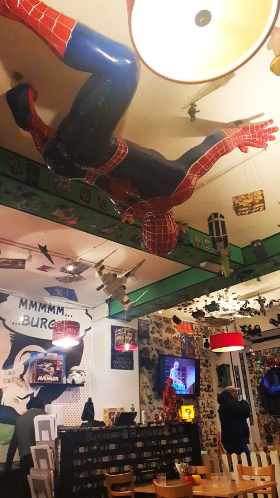Como a hora de jantar chegava fizemos uma das melhores decisões da tarde, irmos jantar não a um local requintado, mas ao Atomic Burguer. E o Atomic Burguer é nem mais nem menos um restaurante coberto de banda desenhada, figuras de ação e super-heróis e mais algumas personagens sem qualquer contexto para se juntar à confusão. Que o diga o homem aranha em tamanho real colado ao teto. A comida é simples, hambúrgueres, cachorros-quentes e nachos. Nada podia ter sido melhor. Os hambúrgueres deliciosos, a música a trazer-nos memórias e a decoração atraente. Bem, atraente para um bando de nerds. E digo-os que o restaurante esteve cheio durante toda a nossa refeição por isso não somos os únicos.