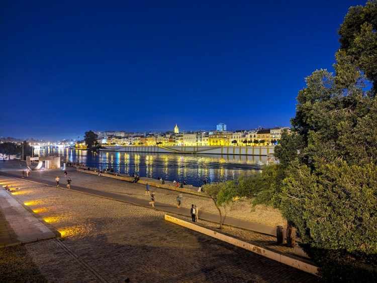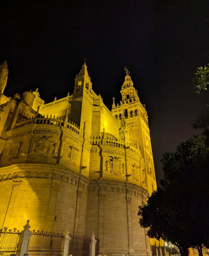 Antes de irmos jantar quisemos primeiro dar uma volta por Sevilha. E apesar de já ter anoitecido a cidade vibrava de gente. Acabámos por ir passear junto ao canal de Alfonso XIII entre duas pontes, el Puente de Isabel II, também conhecida por Puente de Triana e el Puente de S. Telmo. Os edifícios iluminados e a sua luz a refletir no canal, tornaram este passeio quase idílico. Quando chegámos à Puente de S. Telmo, que fica ao lado da Torre del Oro, virámos para o centro de histórico onde vimos pela primeira vez a famosa torre, La Giralda, que faz parte da catedral de Sevilha.