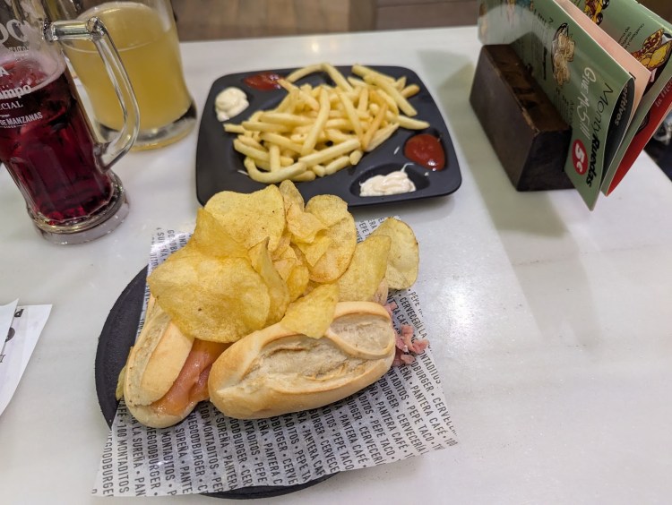 Para pedir as sandes, vai mesmo depender do gosto de cada um, porque a escolha é mesmo imensa. Nós gostámos particularmente do montadito ‘Salón ahumado y crema de queso Camembert’ que era com salmão fumado e queijo Camembert. Também pedimos umas batatas fritas com 4 molhos para partilhar entre nós os dois. Como disse um jantar simples e rápido.