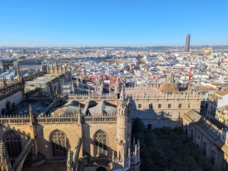 Então, a entrada para quem tem este tipo de bilhetes não é pela Puerta del Principe, o portão principal, mas sim pela entrada que fica mesmo ao lado da torre da Giralda. Quando aqui chegámos já havia uma grande fila. Mas mal as portas abriram a fila começou a andar rápido e em menos de nada entrávamos dentro da catedral. Já que estávamos ali, ao lado da Giralda, foi ao cimo da torre onde fomos primeiro.