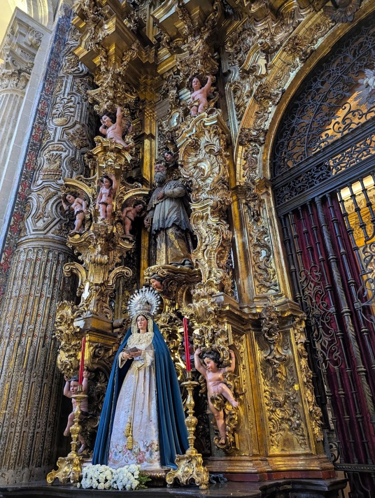 Depois do pequeno-almoço começámos o nosso primeiro dia a explorar Sevilha. Uma das coisas que nós ficámos a saber era que às 9 e meia estávamos prontos para visitar a cidade, mas a cidade não estava pronta para a visitarmos. Ou abria tudo às 10, ou como a catedral de Sevilha, que queríamos visitar durante a manhã, às 11. Como estava tudo fechado, até as igrejas que tínhamos posto no itinerário, andámos um bocado pelas ruas do centro histórico e acabámos por entrar numa igreja que estava aberta, a Capilla de San José. Não constava no itinerário, mas a partir daquele momento em que a porta estava aberta passou a constar.