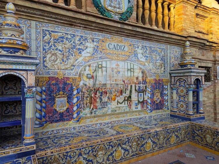 O mais impressionante e o mais conhecido são os bonitos conjuntos de azulejos que cobrem a praça. No total, existem 48 balcões, se assim se podem chamar e cada um representa uma província espanhola, organizados em ordem alfabética. Cada um destes balcões tem um conjunto de azulejos que para além do nome e escudo da província tem uma imagem associada ao local que representa. Também nesta praça encontram-se 4 pontes e cada representa um reino de Espanha: Aragão, Castela, Leão e Navarra. A toda à volta passa um canal de água onde corre o rio Guadalquivir e onde se pode passear por ele num barco alugado a remos.