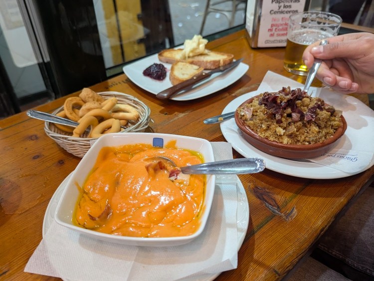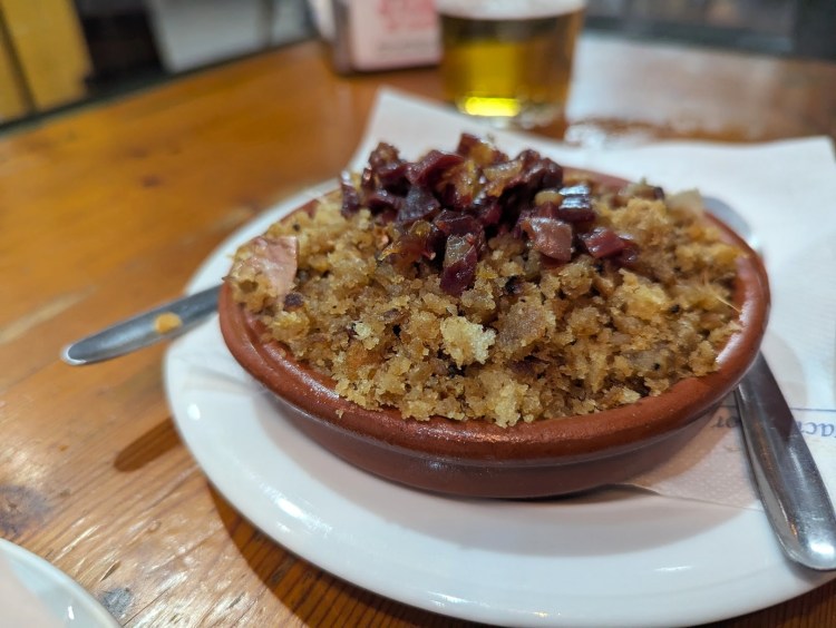 De todos os pratos o que menos se gostou foi a torta de la serena. Agora em relação ao ‘elephant in the room’, o prato mais estranho, o menudo de ternera – eu não consegui comer, nem sequer experimentar. Epá tudo o que seja entranhas faz-me um bocado confusão. No entanto, o meu marido diz e continua a dizer que foi das melhores coisas que comeu durante toda a viagem. Mas nem o seu grande entusiasmo conseguiu-me convencer a provar – também foi da maneira que ele comeu mais. A sopa, o salmorejo, era bom, mas talvez tenha sido o mais fraco da viagem. Depois de comer esta sopa todas as noites havia alguma que ia ficar com menos favoritismo e acho que foi a sopa deste restaurante. Mas gostei das migas, a razão para termos vindo aqui, com um bom sabor a alho e azeite, que em Espanha é de grande qualidade. Acho que nunca me apercebi tanto da diferença que um bom azeite pode fazer na comida como durante esta viagem.