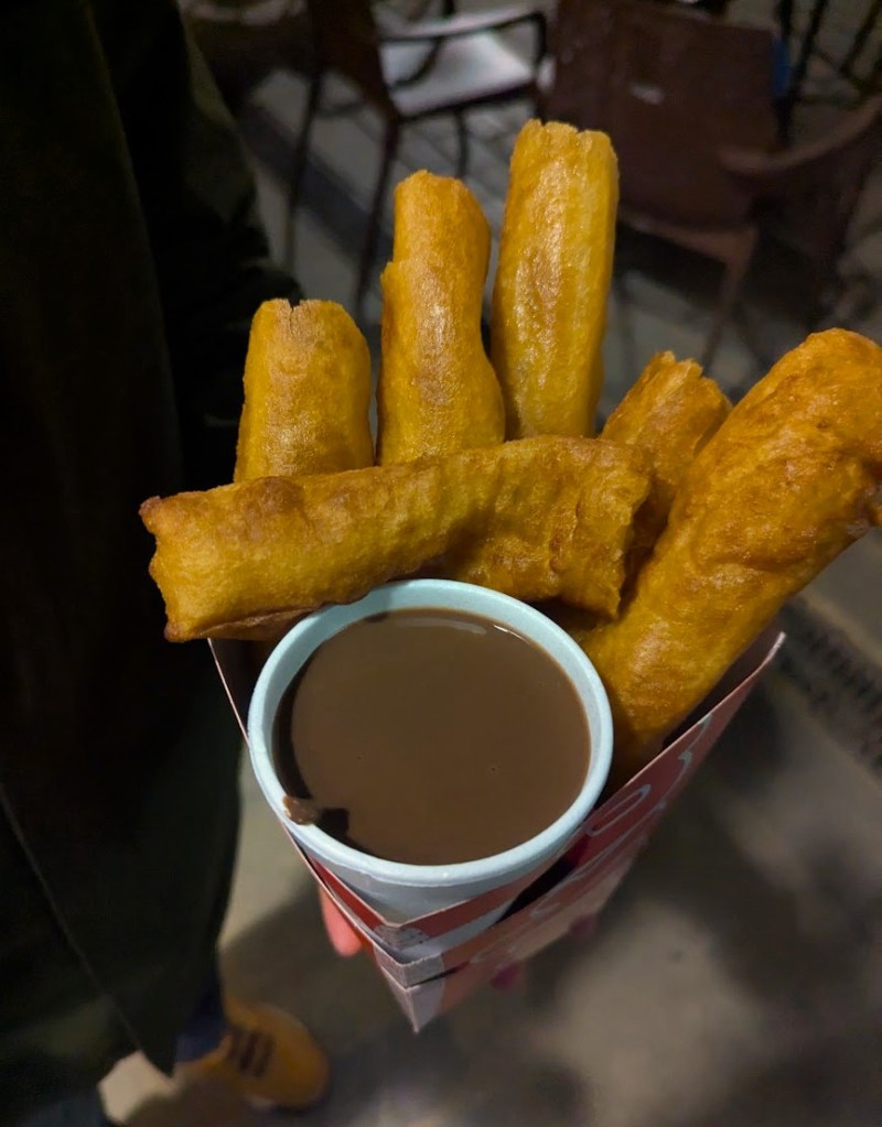 Mas em minha defesa quando chegámos havia gente a fazer o mesmo, por isso 10 horas da noite ainda é uma hora aceitável para comer churros. Pedimos uma porção de churros para dividir que vinha juntamente com o tradicional molho de chocolate. A porção continha 5 churros bem grandinhos que nos custou 6 euros.