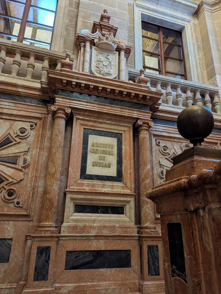 Durante a visita ao Archivo General de Indias vai-se passando por várias salas como a sala da Justiça onde para além de documentos também se encontram estátuas, pinturas e claro impressionantes filas de estantes..