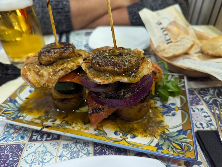 Como só queríamos mesmo petiscar acabámos por pedir um prato para dividir entre os dois. Decidimos pedir Milhoja Ibérica con Chimichurri, um prato que consiste em vários vegetais e carne de porco dispostos em camadas. Os vegetais e a carne vêm acompanhados com o molho de chimichurri, um molho argentino feito à base de azeite, alho, vinagre e ervas aromáticas..