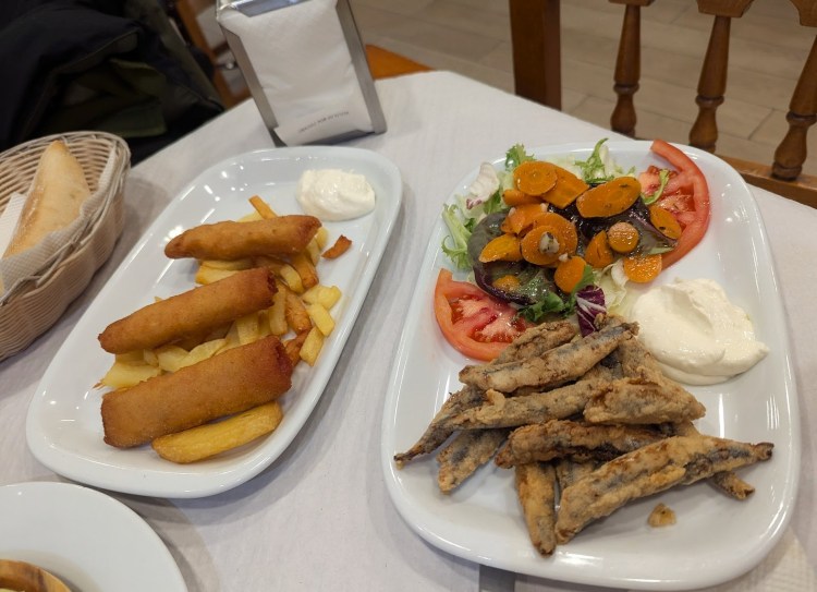 - Boquerones, anchovas fritas servidas com salada e legumes. Eu que não gosto muito deste tipo de prato, de peixe frito, comi os boquerones com satisfação