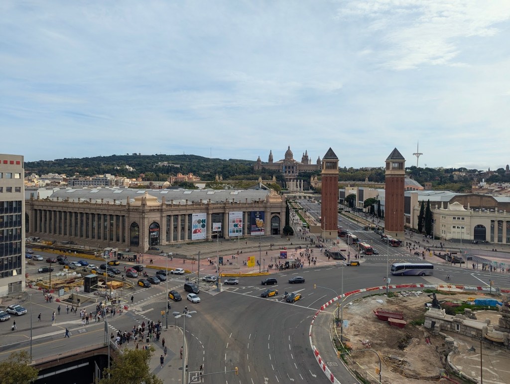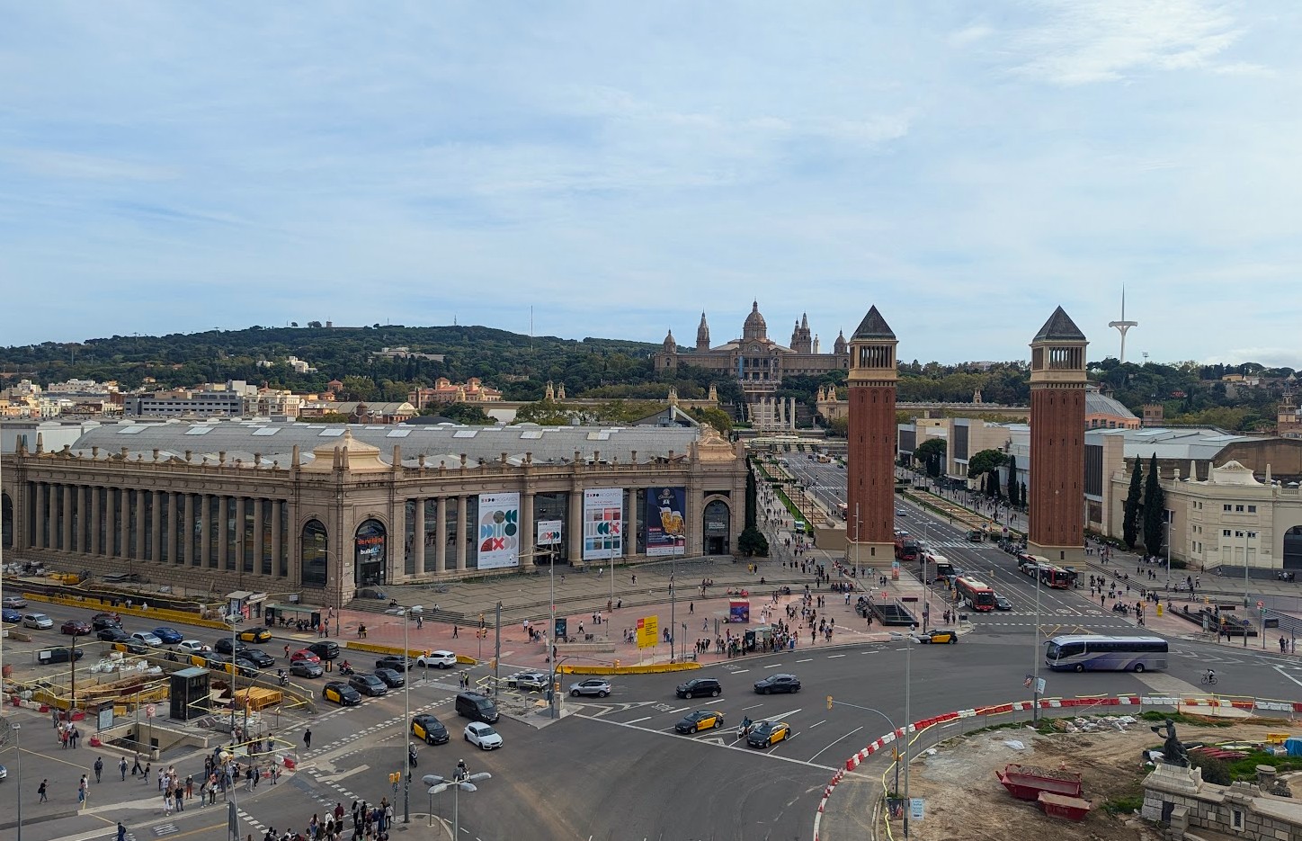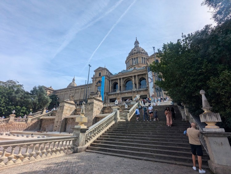 Depois de admirarmos as Torres Venezianas seguimos pela estrada em direcção à escadaria que subia para o Museu Nacional de Arte da Catalunha. A meio do caminho ainda parámos brevemente perto da Fonte Mágica. O seu nome é devido ao conhecido espectáculo de luzes e jactos de água organizado à noite. No entanto nos tempos que correm infelizmente este espectáculo está cancelado pois Barcelona, ou melhor toda a Espanha, tem sofrido de seca extrema. Sendo assim a água fornecida a esta fonte foi cortada. Um alerta de emergência foi comunicado pelas autoridades no início de 2024 depois de 3 anos de seca extrema. Por enquanto o espectáculo da Fonte Mágica é apenas uma miragem.