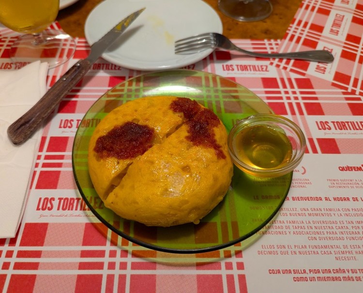Agora em relação à nossa experiência no Los Tortíllez; como o menu inclui outros pratos tradicionais pedimos como entrada o famoso pão com tomate regado com azeite como manda a tradição. Como disse acima, o menu das tortilhas é bastante extenso e o difícil é escolher uma. Há desde tortilhas simples, com ou sem cebola, até tortilhas com bacalhau, calamares, queijos e carnes fumadas. Para provar o que digo basta darem uma olhadela à carta que está disponível no website oficial: https://www.lostortillez.com/carta/. Apesar de não ter visto no menu eu acho que cada uma destas tortilhas se relaciona com um membro da família – mas isto é apenas uma suposição da minha parte.